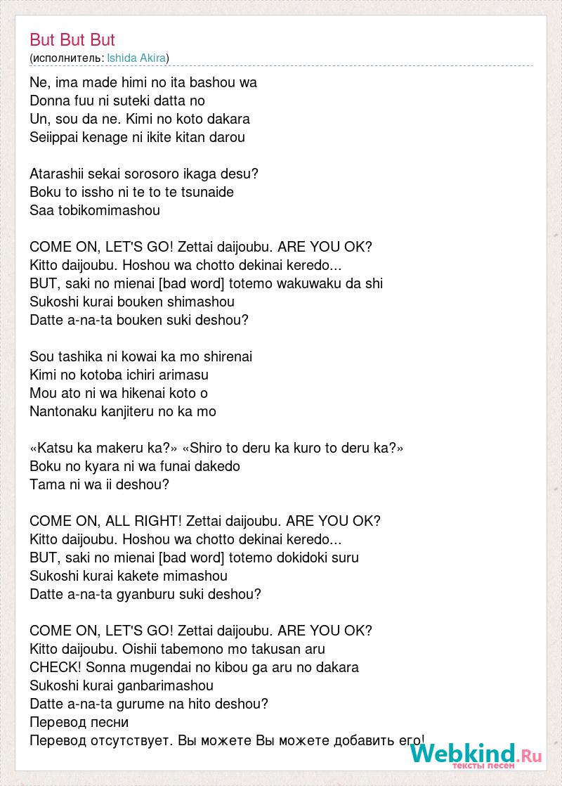 Ne, ima made himi no ita bashou wa Donna fuu ni suteki datta no Un, sou da ne. Kimi no koto dakara Seiippai kenage ni ikite kitan darou Atarashii sekai sorosoro ikaga desu? Boku to issho ni te to te tsunaide Saa tobikomimashou COME ON, LET'S GO! Zettai daijoubu. ARE YOU OK? Kitto daijoubu. Hoshou wa chotto dekinai keredo... BUT, saki no mienai [bad word] totemo wakuwaku da shi Sukoshi kurai bouken shimashou Datte a-na-ta bouken suki deshou? Sou tashika ni kowai ka mo shirenai Kimi no kotoba ichiri arimasu Mou ato ni wa hikenai koto o Nantonaku kanjiteru no ka mo «Katsu ka makeru ka?» «Shiro to deru ka kuro to deru ka?» Boku no kyara ni wa funai dakedo Tama ni wa ii deshou? COME ON, ALL RIGHT! Zettai daijoubu. ARE YOU OK? Kitto daijoubu. Hoshou wa chotto dekinai keredo... BUT, saki no mienai [bad word] totemo dokidoki suru Sukoshi kurai kakete mimashou Datte a-na-ta gyanburu suki deshou? COME ON, LET'S GO! Zettai daijoubu. ARE YOU OK? Kitto daijoubu. Oishii tabemono mo takusan aru CHECK! Sonna mugendai no kibou ga aru no dakara Sukoshi kurai ganbarimashou Datte a-na-ta gurume na hito deshou? Перевод песни Перевод отсутствует. Вы можете Вы можете добавить его!