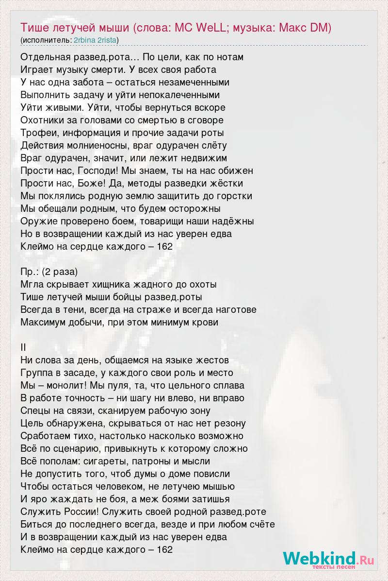 Отдельная развед.рота… По цели, как по нотам Играет музыку смерти. У всех своя работа У нас одна забота – остаться незамеченными Выполнить задачу и уйти непокалеченными Уйти живыми. Уйти, чтобы вернуться вскоре Охотники за головами со смертью в сговоре Трофеи, информация и прочие задачи роты Действия молниеносны, враг одурачен слёту Враг одурачен, значит, или лежит недвижим Прости нас, Господи! Мы знаем, ты на нас обижен Прости нас, Боже! Да, методы разведки жёстки Мы поклялись родную землю защитить до горстки Мы обещали родным, что будем осторожны Оружие проверено боем, товарищи наши надёжны Но в возвращении каждый из нас уверен едва Клеймо на сердце каждого – 162 Пр.: (2 раза) Мгла скрывает хищника жадного до охоты Тише летучей мыши бойцы развед.роты Всегда в тени, всегда на страже и всегда наготове Максимум добычи, при этом минимум крови II Ни слова за день, общаемся на языке жестов Группа в засаде, у каждого свои роль и место Мы – монолит! Мы пуля, та, что цельного сплава В работе точность – ни шагу ни влево, ни вправо Спецы на связи, сканируем рабочую зону Цель обнаружена, скрываться от нас нет резону Сработаем тихо, настолько насколько возможно Всё по сценарию, привыкнуть к которому сложно Всё пополам: сигареты, патроны и мысли Не допустить того, чтоб думы о доме повисли Чтобы остаться человеком, не летучею мышью И яро жаждать не боя, а меж боями затишья Служить России! Служить своей родной развед.роте Биться до последнего всегда, везде и при любом счёте И в возвращении каждый из нас уверен едва Клеймо на сердце каждого – 162
