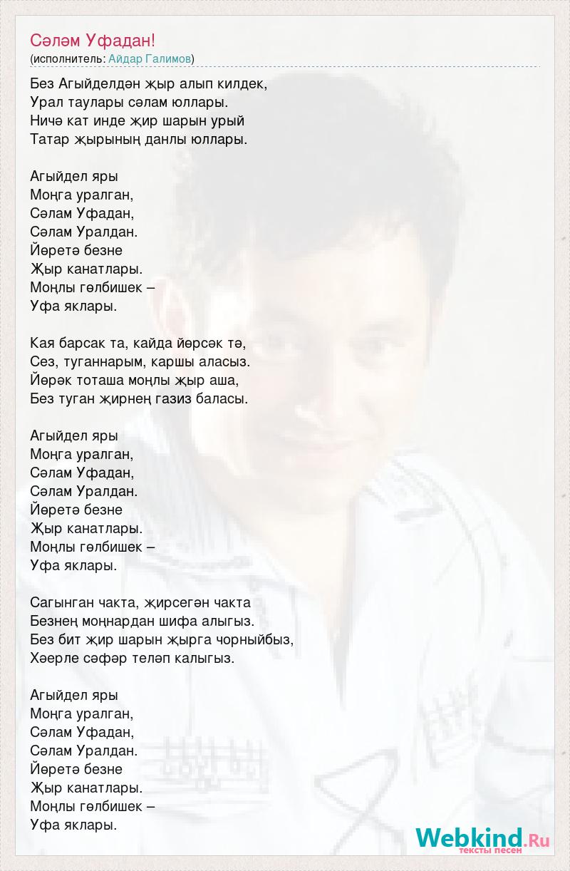 Без Агыйделдән җыр алып килдек, Урал таулары сәлам юллары. Ничә кат инде җир шарын урый Татар җырының данлы юллары. Агыйдел яры Моңга уралган, Сәлам Уфадан, Сәлам Уралдан. Йөретә безне Җыр канатлары. Моңлы гөлбишек – Уфа яклары. Кая барсак та, кайда йөрсәк тә, Сез, туганнарым, каршы аласыз. Йөрәк тоташа моңлы җыр аша, Без туган җирнең газиз баласы. Агыйдел яры Моңга уралган, Сәлам Уфадан, Сәлам Уралдан. Йөретә безне Җыр канатлары. Моңлы гөлбишек – Уфа яклары. Сагынган чакта, җирсегән чакта Безнең моңнардан шифа алыгыз. Без бит җир шарын җырга чорныйбыз, Хәерле сәфәр теләп калыгыз. Агыйдел яры Моңга уралган, Сәлам Уфадан, Сәлам Уралдан. Йөретә безне Җыр канатлары. Моңлы гөлбишек – Уфа яклары.