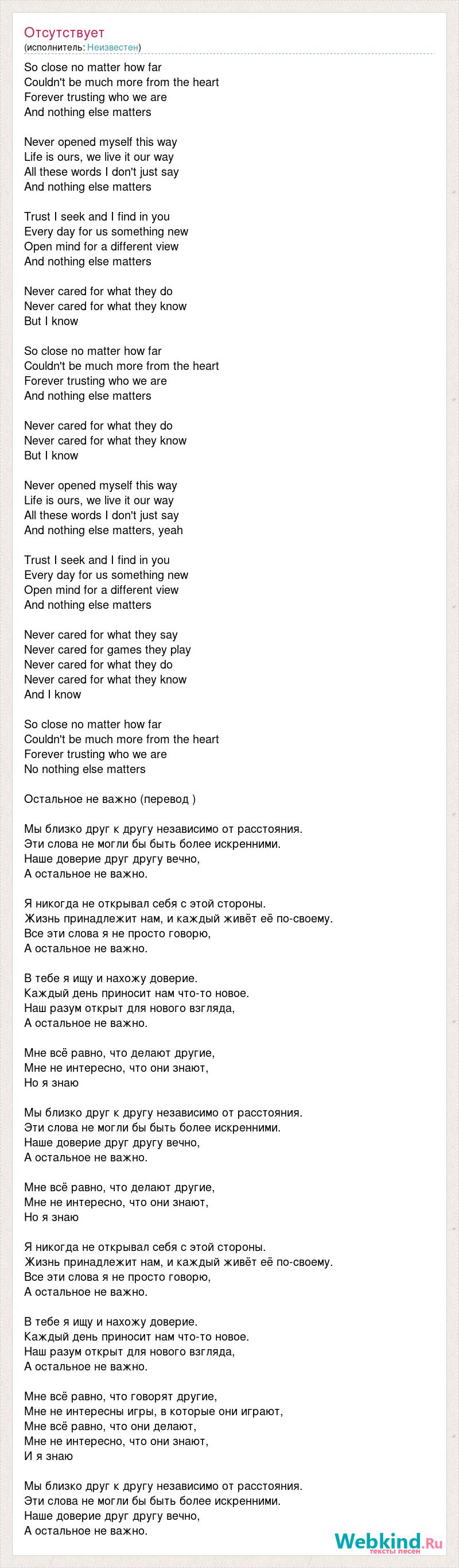 So close no matter how far Couldn't be much more from the heart Forever trusting who we are And nothing else matters Never opened myself this way Life is ours, we live it our way All these words I don't just say And nothing else matters Trust I seek and I find in you Every day for us something new Open mind for a different view And nothing else matters Never cared for what they do Never cared for what they know But I know So close no matter how far Couldn't be much more from the heart Forever trusting who we are And nothing else matters Never cared for what they do Never cared for what they know But I know Never opened myself this way Life is ours, we live it our way All these words I don't just say And nothing else matters, yeah Trust I seek and I find in you Every day for us something new Open mind for a different view And nothing else matters Never cared for what they say Never cared for games they play Never cared for what they do Never cared for what they know And I know So close no matter how far Couldn't be much more from the heart Forever trusting who we are No nothing else matters Остальное не важно (перевод ) Мы близко друг к другу независимо от расстояния. Эти слова не могли бы быть более искренними. Наше доверие друг другу вечно, А остальное не важно. Я никогда не открывал себя с этой стороны. Жизнь принадлежит нам, и каждый живёт её по-своему. Все эти слова я не просто говорю, А остальное не важно. В тебе я ищу и нахожу доверие. Каждый день приносит нам что-то новое. Наш разум открыт для нового взгляда, А остальное не важно. Мне всё равно, что делают другие, Мне не интересно, что они знают, Но я знаю Мы близко друг к другу независимо от расстояния. Эти слова не могли бы быть более искренними. Наше доверие друг другу вечно, А остальное не важно. Мне всё равно, что делают другие, Мне не интересно, что они знают, Но я знаю Я никогда не открывал себя с этой стороны. Жизнь принадлежит нам, и каждый живёт её по-своему. Все эти слова я не просто говорю, А остальное не важно. В тебе я ищу и нахожу доверие. Каждый день приносит нам что-то новое. Наш разум открыт для нового взгляда, А остальное не важно. Мне всё равно, что говорят другие, Мне не интересны игры, в которые они играют, Мне всё равно, что они делают, Мне не интересно, что они знают, И я знаю Мы близко друг к другу независимо от расстояния. Эти слова не могли бы быть более искренними. Наше доверие друг другу вечно, А остальное не важно.