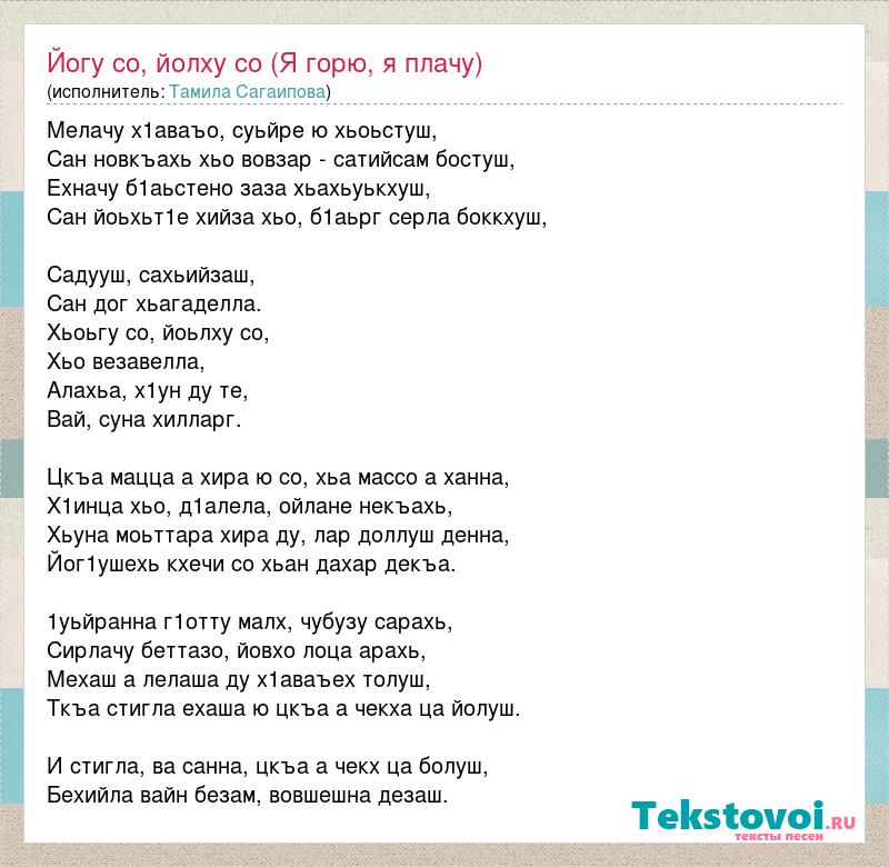 Мелачу х1аваъо, суьйре ю хьоьстуш, Сан новкъахь хьо вовзар - сатийсам бостуш, Ехначу б1аьстено заза хьахьуькхуш, Сан йоьхьт1е хийза хьо, б1аьрг серла боккхуш, Садууш, сахьийзаш, Сан дог хьагаделла. Хьоьгу со, йоьлху со, Хьо везавелла, Алахьа, х1ун ду те, Вай, суна хилларг. Цкъа мацца а хира ю со, хьа массо а ханна, Х1инца хьо, д1алела, ойлане некъахь, Хьуна моьттара хира ду, лар доллуш денна, Йог1ушехь кхечи со хьан дахар декъа. 1уьйранна г1отту малх, чубузу сарахь, Сирлачу беттазо, йовхо лоца арахь, Мехаш а лелаша ду х1аваъех толуш, Ткъа стигла ехаша ю цкъа а чекха ца йолуш. И стигла, ва санна, цкъа а чекх ца болуш, Бехийла вайн безам, вовшешна дезаш.