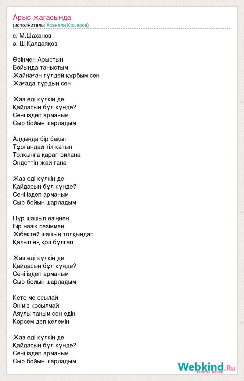 с. М.Шаханов ә. Ш.Қалдаяқов Өзіңмен Арыстың Бойында таныстым Жайнаған гүлдей құрбым сен Жағада тұрдың сен Жаз еді күлкің де Қайдасың бұл күнде? Сені іздеп арманым Сыр бойын шарладым Алдыңда бір бақыт Тұрғандай тіл қатып Толқынға қарап ойлана Әндеттің жай ғана Жаз еді күлкің де Қайдасың бұл күнде? Сені іздеп арманым Сыр бойын шарладым Нұр шашып өзіңнен Бір нәзік сезіммен Жібектей шашың толқындап Қалып ең қол бұлғап Жаз еді күлкің де Қайдасың бұл күнде? Сені іздеп арманым Сыр бойын шарладым Кете ме осылай Әніміз қосылмай Аяулы таңым сен едің Көрсем деп келемін Жаз еді күлкің де Қайдасың бұл күнде? Сені іздеп арманым Сыр бойын шарладым