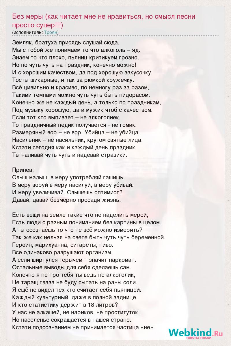 Земляк, братуха присядь слушай сюда. Мы с тобой же понимаем то что алкоголь – яд. Знаем то что плохо, пьяниц критикуем грозно. Но по чуть чуть на праздник, конечно можно! И с хорошим качеством, да под хорошую закусочку. Тосты шикарные, и так за рюмкой кружечку. Всё цивильно и красиво, по немногу раз за разом, Такими темпами можно чуть чуть быть пидорасом. Конечно же не каждый день, а только по праздникам, Под музыку хорошую, да и мужик чтоб с качеством. Если тот кто выпивает – не алкоголиек, То праздничный педик получается - не гомик. Размеряный вор – не вор. Убийца – не убийца. Насильник – не насильник, кругом святые лица. Кстати сегодня как и каждый день праздник. Ты наливай чуть чуть и надевай стразики. Припев: Слыш малыш, в меру употребляй гашишь. В меру воруй в меру насилуй, в меру убивай. И меру увеличивай. Слышешь оптимист? Давай, давай безмерно просади жизнь. Есть вещи на земле такие что не наделить мерой, Есть люди с разным пониманием без картины в целом. А ты осознаёшь то что не всё можно измерить? Так же как нельзя на свете быть чуть чуть беременной. Героин, марихуанна, сигареты, пиво. Все одинаково разрушают организм. А если ширнулся герычем – значит наркоман. Остальные выводы для себя сделаешь сам. Конечно я не про тебя ты ведь не алкоголик, Не таращ глаза не буду сыпать на раны соли. Я ещё не видел тех кто считает себя пьяницей. Каждый культурный, даже в полной заднице. И кто статистику держит в 18 литров? У нас не алкашей, не нариков, не проституток. Но населенье сокращается в нашей стране. Кстати подсознанием не принимается частица «не».