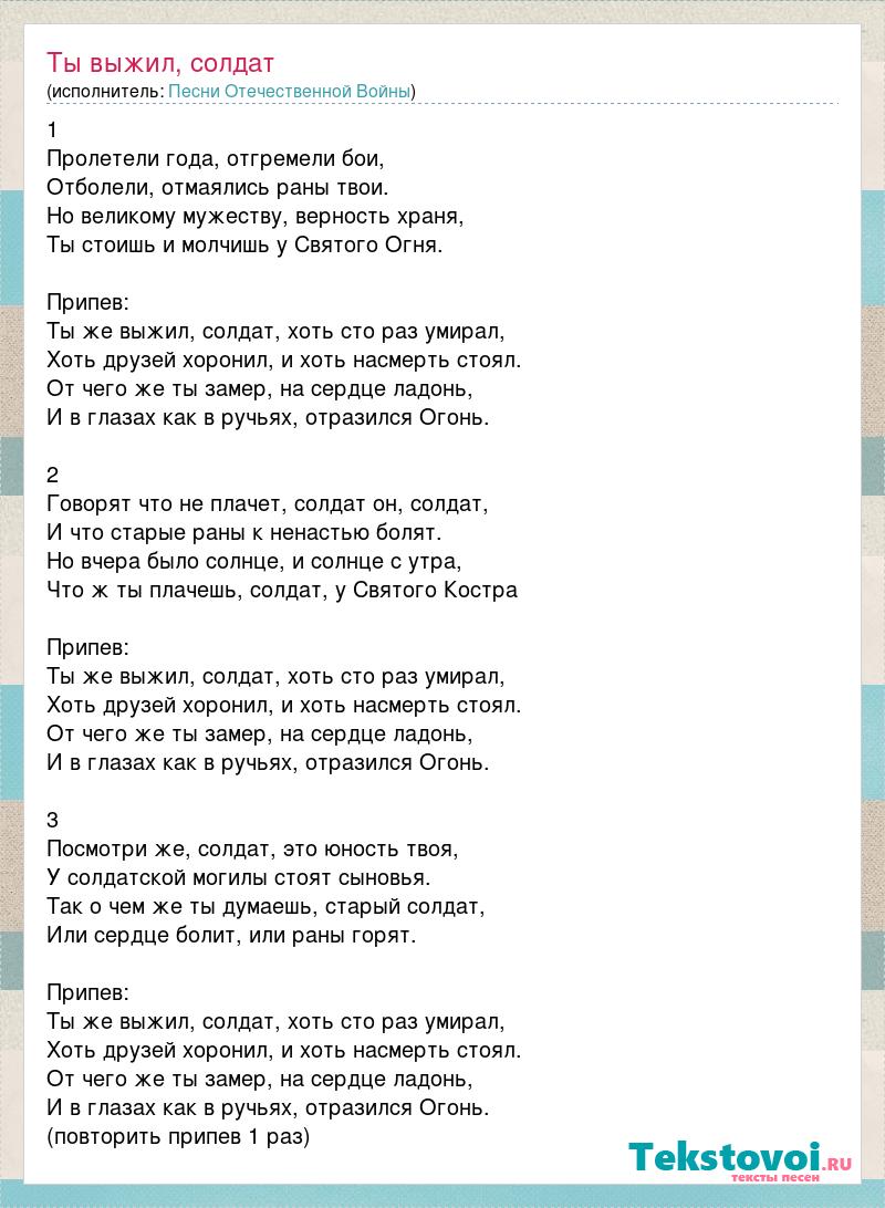 1 Пролетели года, отгремели бои, Отболели, отмаялись раны твои. Но великому мужеству, верность храня, Ты стоишь и молчишь у Святого Огня. Припев: Ты же выжил, солдат, хоть сто раз умирал, Хоть друзей хоронил, и хоть насмерть стоял. От чего же ты замер, на сердце ладонь, И в глазах как в ручьях, отразился Огонь. 2 Говорят что не плачет, солдат он, солдат, И что старые раны к ненастью болят. Но вчера было солнце, и солнце с утра, Что ж ты плачешь, солдат, у Святого Костра Припев: Ты же выжил, солдат, хоть сто раз умирал, Хоть друзей хоронил, и хоть насмерть стоял. От чего же ты замер, на сердце ладонь, И в глазах как в ручьях, отразился Огонь. 3 Посмотри же, солдат, это юность твоя, У солдатской могилы стоят сыновья. Так о чем же ты думаешь, старый солдат, Или сердце болит, или раны горят. Припев: Ты же выжил, солдат, хоть сто раз умирал, Хоть друзей хоронил, и хоть насмерть стоял. От чего же ты замер, на сердце ладонь, И в глазах как в ручьях, отразился Огонь. (повторить припев 1 раз)