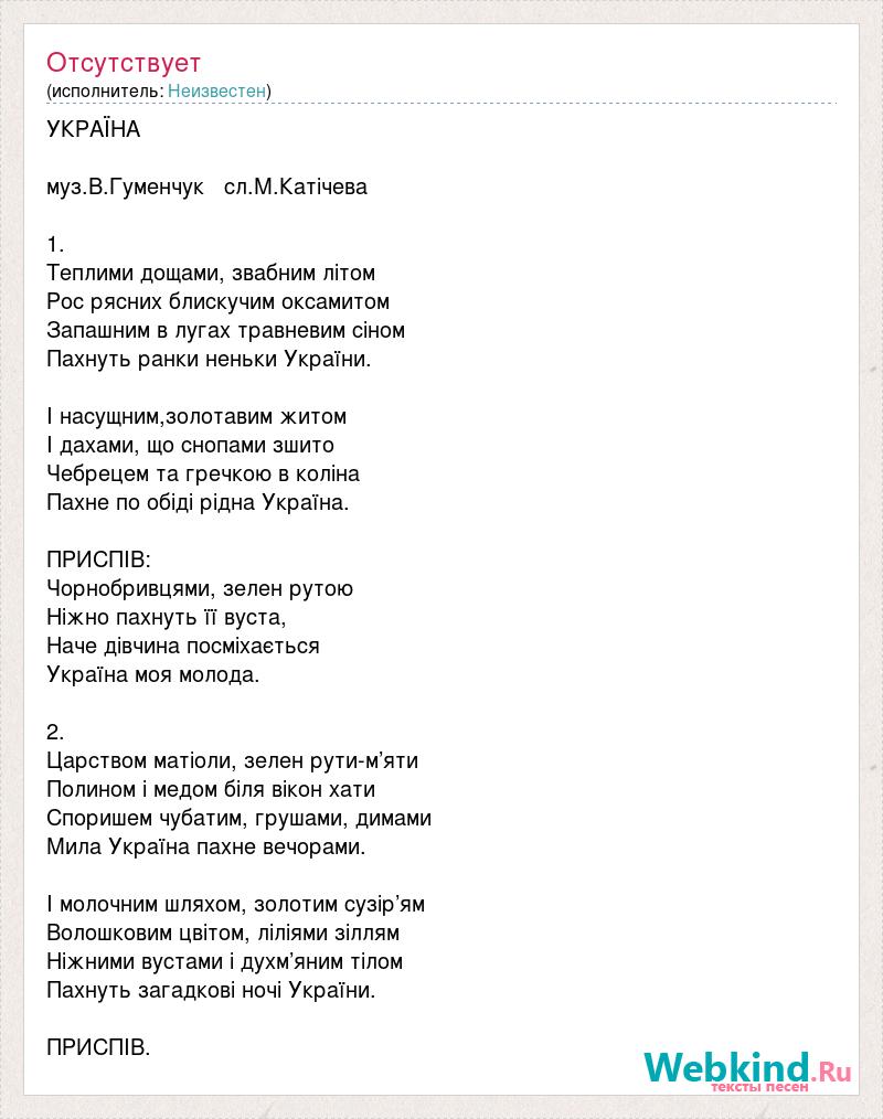 УКРАЇНА муз.В.Гуменчук сл.М.Катічева 1. Теплими дощами, звабним літом Рос рясних блискучим оксамитом Запашним в лугах травневим сіном Пахнуть ранки неньки України. І насущним,золотавим житом І дахами, що снопами зшито Чебрецем та гречкою в коліна Пахне по обіді рідна Україна. ПРИСПІВ: Чорнобривцями, зелен рутою Ніжно пахнуть її вуста, Наче дівчина посміхається Україна моя молода. 2. Царством матіоли, зелен рути-м’яти Полином і медом біля вікон хати Споришем чубатим, грушами, димами Мила Україна пахне вечорами. І молочним шляхом, золотим сузір’ям Волошковим цвітом, ліліями зіллям Ніжними вустами і духм’яним тілом Пахнуть загадкові ночі України. ПРИСПІВ.