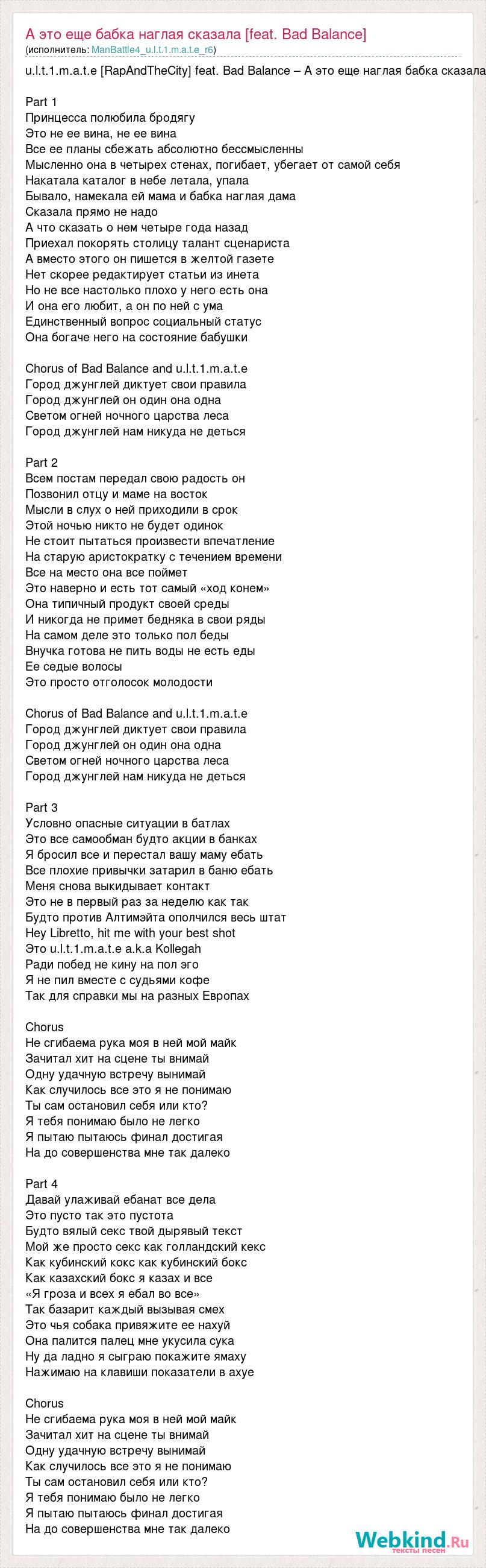 u.l.t.1.m.a.t.e [RapAndTheCity] feat. Bad Balance – А это еще наглая бабка сказала Part 1 Принцесса полюбила бродягу Это не ее вина, не ее вина Все ее планы сбежать абсолютно бессмысленны Мысленно она в четырех стенах, погибает, убегает от самой себя Накатала каталог в небе летала, упала Бывало, намекала ей мама и бабка наглая дама Сказала прямо не надо А что сказать о нем четыре года назад Приехал покорять столицу талант сценариста А вместо этого он пишется в желтой газете Нет скорее редактирует статьи из инета Но не все настолько плохо у него есть она И она его любит, а он по ней с ума Единственный вопрос социальный статус Она богаче него на состояние бабушки Chorus of Bad Balance and u.l.t.1.m.a.t.e Город джунглей диктует свои правила Город джунглей он один она одна Светом огней ночного царства леса Город джунглей нам никуда не деться Part 2 Всем постам передал свою радость он Позвонил отцу и маме на восток Мысли в слух о ней приходили в срок Этой ночью никто не будет одинок Не стоит пытаться произвести впечатление На старую аристократку с течением времени Все на место она все поймет Это наверно и есть тот самый «ход конем» Она типичный продукт своей среды И никогда не примет бедняка в свои ряды На самом деле это только пол беды Внучка готова не пить воды не есть еды Ее седые волосы Это просто отголосок молодости Chorus of Bad Balance and u.l.t.1.m.a.t.e Город джунглей диктует свои правила Город джунглей он один она одна Светом огней ночного царства леса Город джунглей нам никуда не деться Part 3 Условно опасные ситуации в батлах Это все самообман будто акции в банках Я бросил все и перестал вашу маму ебать Все плохие привычки затарил в баню ебать Меня снова выкидывает контакт Это не в первый раз за неделю как так Будто против Алтимэйта ополчился весь штат Hey Libretto, hit me with your best shot Это u.l.t.1.m.a.t.e a.k.a Kollegah Ради побед не кину на пол эго Я не пил вместе с судьями кофе Так для справки мы на разных Европах Chorus Не сгибаема рука моя в ней мой майк Зачитал хит на сцене ты внимай Одну удачную встречу вынимай Как случилось все это я не понимаю Ты сам остановил себя или кто? Я тебя понимаю было не легко Я пытаю пытаюсь финал достигая На до совершенства мне так далеко Part 4 Давай улаживай ебанат все дела Это пусто так это пустота Будто вялый секс твой дырявый текст Мой же просто секс как голландский кекс Как кубинский кокс как кубинский бокс Как казахский бокс я казах и все «Я гроза и всех я ебал во все» Так базарит каждый вызывая смех Это чья собака привяжите ее нахуй Она палится палец мне укусила сука Ну да ладно я сыграю покажите ямаху Нажимаю на клавиши показатели в ахуе Chorus Не сгибаема рука моя в ней мой майк Зачитал хит на сцене ты внимай Одну удачную встречу вынимай Как случилось все это я не понимаю Ты сам остановил себя или кто? Я тебя понимаю было не легко Я пытаю пытаюсь финал достигая На до совершенства мне так далеко