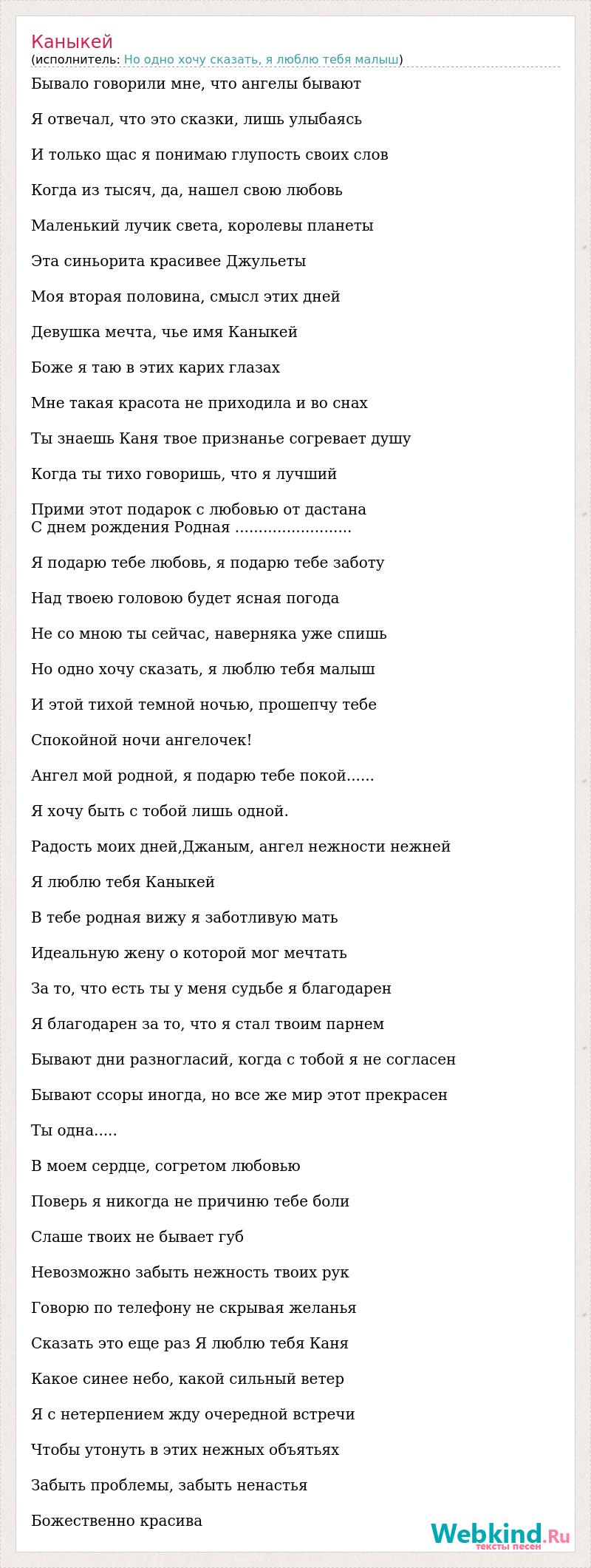 Бывало говорили мне, что ангелы бывают Я отвечал, что это сказки, лишь улыбаясь И только щас я понимаю глупость своих слов Когда из тысяч, да, нашел свою любовь Маленький лучик света, королевы планеты Эта синьорита красивее Джульеты Моя вторая половина, смысл этих дней Девушка мечта, чье имя Каныкей Боже я таю в этих карих глазах Мне такая красота не приходила и во снах Ты знаешь Каня твое признанье согревает душу Когда ты тихо говоришь, что я лучший Прими этот подарок с любовью от дастана С днем рождения Родная ......................... Я подарю тебе любовь, я подарю тебе заботу Над твоею головою будет ясная погода Не со мною ты сейчас, наверняка уже спишь Но одно хочу сказать, я люблю тебя малыш И этой тихой темной ночью, прошепчу тебе Спокойной ночи ангелочек! Ангел мой родной, я подарю тебе покой...... Я хочу быть с тобой лишь одной. Радость моих дней,Джаным, ангел нежности нежней Я люблю тебя Каныкей В тебе родная вижу я заботливую мать Идеальную жену о которой мог мечтать За то, что есть ты у меня судьбе я благодарен Я благодарен за то, что я стал твоим парнем Бывают дни разногласий, когда с тобой я не согласен Бывают ссоры иногда, но все же мир этот прекрасен Ты одна..... В моем сердце, согретом любовью Поверь я никогда не причиню тебе боли Слаше твоих не бывает губ Невозможно забыть нежность твоих рук Говорю по телефону не скрывая желанья Сказать это еще раз Я люблю тебя Каня Какое синее небо, какой сильный ветер Я с нетерпением жду очередной встречи Чтобы утонуть в этих нежных объятьях Забыть проблемы, забыть ненастья Божественно красива