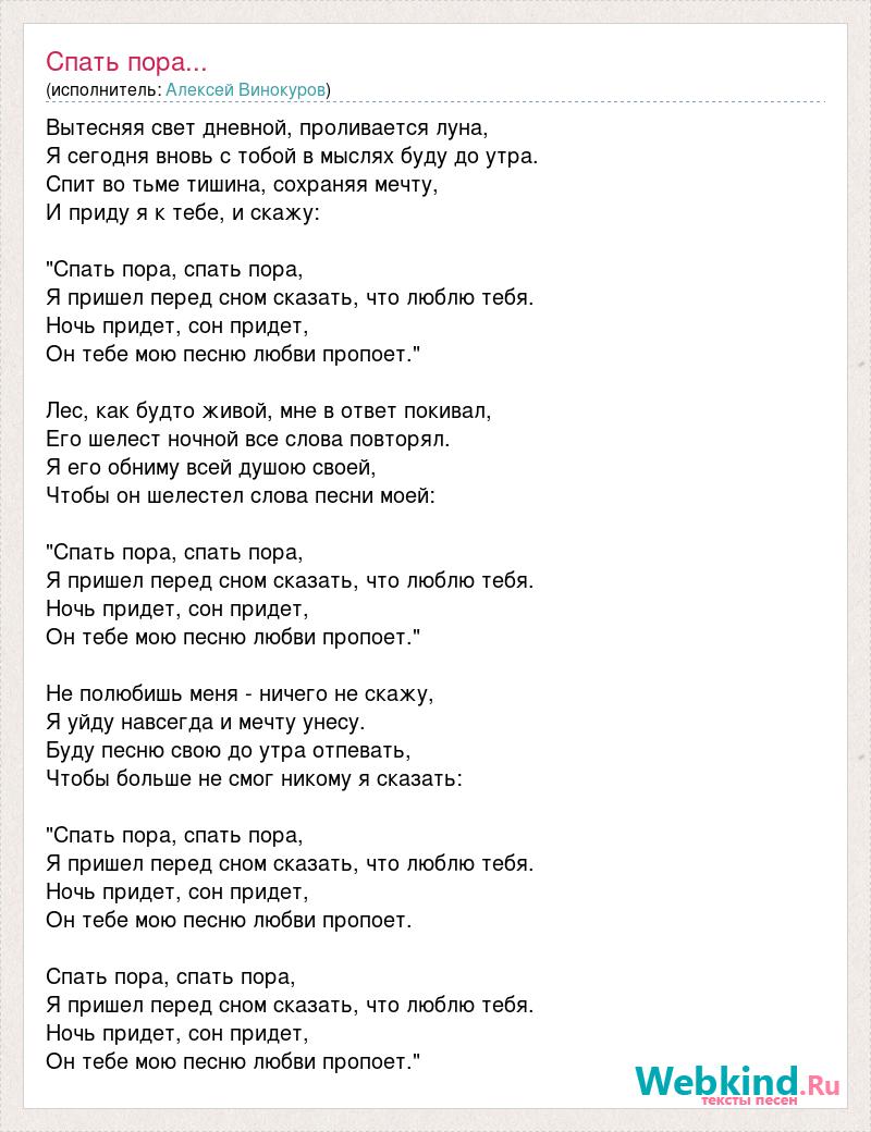 Вытесняя свет дневной, проливается луна, Я сегодня вновь с тобой в мыслях буду до утра. Спит во тьме тишина, сохраняя мечту, И приду я к тебе, и скажу: "Спать пора, спать пора, Я пришел перед сном сказать, что люблю тебя. Ночь придет, сон придет, Он тебе мою песню любви пропоет." Лес, как будто живой, мне в ответ покивал, Его шелест ночной все слова повторял. Я его обниму всей душою своей, Чтобы он шелестел слова песни моей: "Спать пора, спать пора, Я пришел перед сном сказать, что люблю тебя. Ночь придет, сон придет, Он тебе мою песню любви пропоет." Не полюбишь меня - ничего не скажу, Я уйду навсегда и мечту унесу. Буду песню свою до утра отпевать, Чтобы больше не смог никому я сказать: "Спать пора, спать пора, Я пришел перед сном сказать, что люблю тебя. Ночь придет, сон придет, Он тебе мою песню любви пропоет. Спать пора, спать пора, Я пришел перед сном сказать, что люблю тебя. Ночь придет, сон придет, Он тебе мою песню любви пропоет."