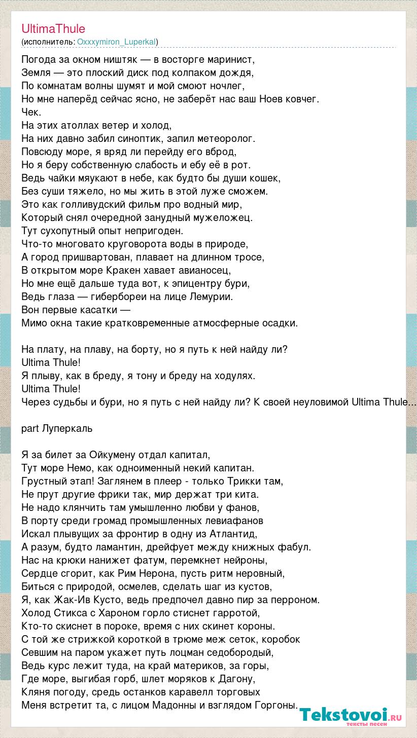 Погода за окном ништяк — в восторге маринист, Земля — это плоский диск под колпаком дождя, По комнатам волны шумят и мой смоют ночлег, Но мне наперёд сейчас ясно, не заберёт нас ваш Ноев ковчег. Чек. На этих атоллах ветер и холод, На них давно забил синоптик, запил метеоролог. Повсюду море, я вряд ли перейду его вброд, Но я беру собственную слабость и ебу её в рот. Ведь чайки мяукают в небе, как будто бы души кошек, Без суши тяжело, но мы жить в этой луже сможем. Это как голливудский фильм про водный мир, Который снял очередной занудный мужеложец. Тут сухопутный опыт непригоден. Что-то многовато круговорота воды в природе, А город пришвартован, плавает на длинном тросе, В открытом море Кракен хавает авианосец, Но мне ещё дальше туда вот, к эпицентру бури, Ведь глаза — гибербореи на лице Лемурии. Вон первые касатки — Мимо окна такие кратковременные атмосферные осадки. На плату, на плаву, на борту, но я путь к ней найду ли? Ultima Thule! Я плыву, как в бреду, я тону и бреду на ходулях. Ultima Thule! Через судьбы и бури, но я путь с ней найду ли? К своей неуловимой Ultima Thule... part Луперкаль Я за билет за Ойкумену отдал капитал, Тут море Немо, как одноименный некий капитан. Грустный этап! Заглянем в плеер - только Трикки там, Не прут другие фрики так, мир держат три кита. Не надо клянчить там умышленно любви у фанов, В порту среди громад промышленных левиафанов Искал плывущих за фронтир в одну из Атлантид, А разум, будто ламантин, дрейфует между книжных фабул. Нас на крюки нанижет фатум, перемкнет нейроны, Сердце сгорит, как Рим Нерона, пусть ритм неровный, Биться с природой, осмелев, сделать шаг из кустов, Я, как Жак-Ив Кусто, ведь предпочел давно пир за перроном. Холод Стикса с Хароном горло стиснет гарротой, Кто-то скиснет в пороке, время с них скинет короны. С той же стрижкой короткой в трюме меж сеток, коробок Севшим на паром укажет путь лоцман седобородый, Ведь курс лежит туда, на край материков, за горы, Где море, выгибая горб, шлет моряков к Дагону, Кляня погоду, средь останков каравелл торговых Меня встретит та, с лицом Мадонны и взглядом Горгоны.
