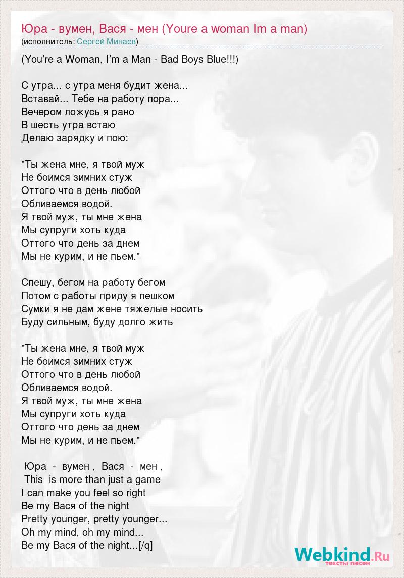 (You’re a Woman, I’m a Man - Bad Boys Blue!!!) С утра... с утра меня будит жена... Вставай... Тебе на работу пора... Вечером ложусь я рано В шесть утра встаю Делаю зарядку и пою: "Ты жена мне, я твой муж Не боимся зимних стуж Оттого что в день любой Обливаемся водой. Я твой муж, ты мне жена Мы супруги хоть куда Оттого что день за днем Мы не курим, и не пьем." Спешу, бегом на работу бегом Потом с работы приду я пешком Сумки я не дам жене тяжелые носить Буду сильным, буду долго жить "Ты жена мне, я твой муж Не боимся зимних стуж Оттого что в день любой Обливаемся водой. Я твой муж, ты мне жена Мы супруги хоть куда Оттого что день за днем Мы не курим, и не пьем." Юра - вумен , Вася - мен , This is more than just a game I can make you feel so right Be my Вася of the night Pretty younger, pretty younger... Oh my mind, oh my mind... Be my Вася of the night...[/q]