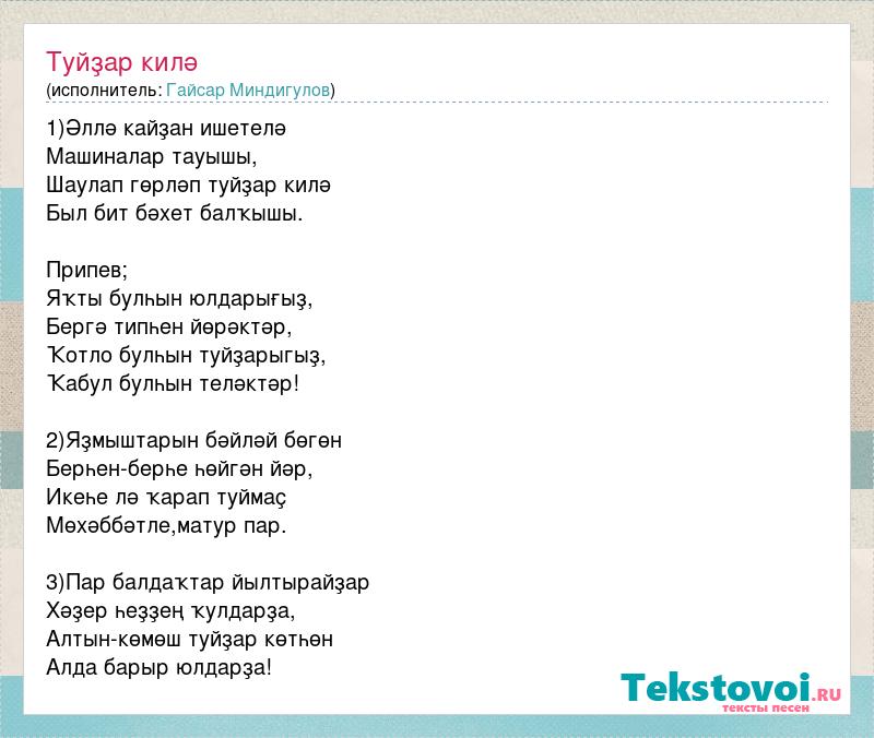 1)Әллә кайҙан ишетелә Машиналар тауышы, Шаулап гөрләп туйҙар килә Был бит бәхет балҡышы. Припев; Яҡты булһын юлдарығыҙ, Бергә типһен йөрәктәр, Ҡотло булһын туйҙарыгыҙ, Ҡабул булһын теләктәр! 2)Яҙмыштарын бәйләй бөгөн Берһен-берһе һөйгән йәр, Икеһе лә ҡарап туймаҫ Мөхәббәтле,матур пар. 3)Пар балдаҡтар йылтырайҙар Хәҙер һеҙҙең ҡулдарҙа, Алтын-көмөш туйҙар көтһөн Алда барыр юлдарҙа!