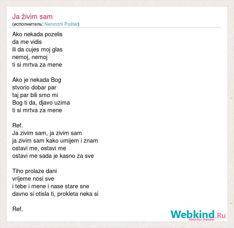 Ako nekada pozelis da me vidis ili da cujes moj glas nemoj, nemoj ti si mrtva za mene Ako je nekada Bog stvorio dobar par taj par bili smo mi Bog ti da, djavo uzima ti si mrtva za mene Ref. Ja zivim sam, ja zivim sam ja zivim sam kako umijem i znam ostavi me, ostavi me ostavi me sada je kasno za sve Tiho prolaze dani vrijeme nosi sve i tebe i mene i nase stare sne davno si otisla ti, prokleta neka si Ref.