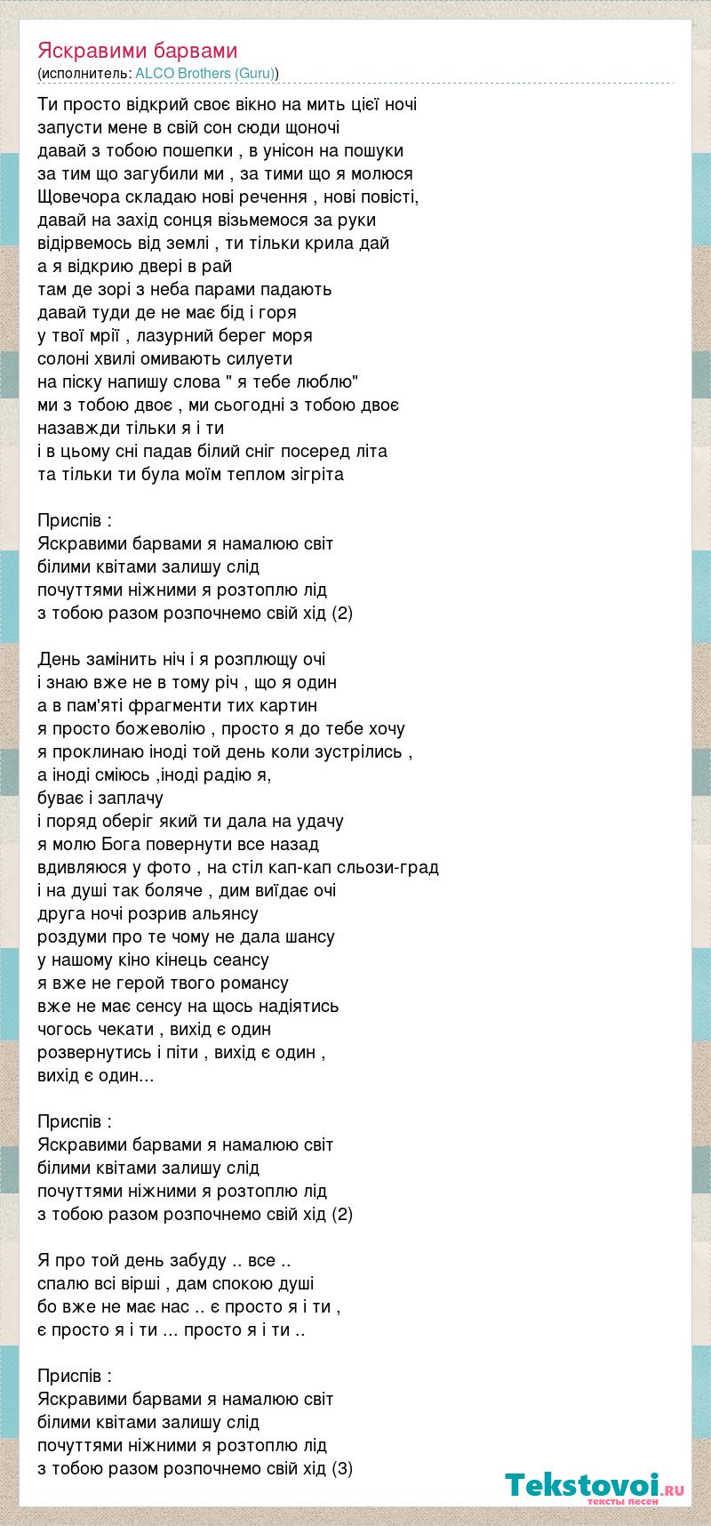 Ти просто відкрий своє вікно на мить цієї ночі запусти мене в свій сон сюди щоночі давай з тобою пошепки , в унісон на пошуки за тим що загубили ми , за тими що я молюся Щовечора складаю нові речення , нові повісті, давай на захід сонця візьмемося за руки відірвемось від землі , ти тільки крила дай а я відкрию двері в рай там де зорі з неба парами падають давай туди де не має бід і горя у твої мрії , лазурний берег моря солоні хвилі омивають силуети на піску напишу слова " я тебе люблю" ми з тобою двоє , ми сьогодні з тобою двоє назавжди тільки я і ти і в цьому сні падав білий сніг посеред літа та тільки ти була моїм теплом зігріта Приспів : Яскравими барвами я намалюю світ білими квітами залишу слід почуттями ніжними я розтоплю лід з тобою разом розпочнемо свій хід (2) День замінить ніч і я розплющу очі і знаю вже не в тому річ , що я один а в пам'яті фрагменти тих картин я просто божеволію , просто я до тебе хочу я проклинаю іноді той день коли зустрілись , а іноді сміюсь ,іноді радію я, буває і заплачу і поряд оберіг який ти дала на удачу я молю Бога повернути все назад вдивляюся у фото , на стіл кап-кап сльози-град і на душі так боляче , дим виїдає очі друга ночі розрив альянсу роздуми про те чому не дала шансу у нашому кіно кінець сеансу я вже не герой твого романсу вже не має сенсу на щось надіятись чогось чекати , вихід є один розвернутись і піти , вихід є один , вихід є один... Приспів : Яскравими барвами я намалюю світ білими квітами залишу слід почуттями ніжними я розтоплю лід з тобою разом розпочнемо свій хід (2) Я про той день забуду .. все .. спалю всі вірші , дам спокою душі бо вже не має нас .. є просто я і ти , є просто я і ти ... просто я і ти .. Приспів : Яскравими барвами я намалюю світ білими квітами залишу слід почуттями ніжними я розтоплю лід з тобою разом розпочнемо свій хід (3)