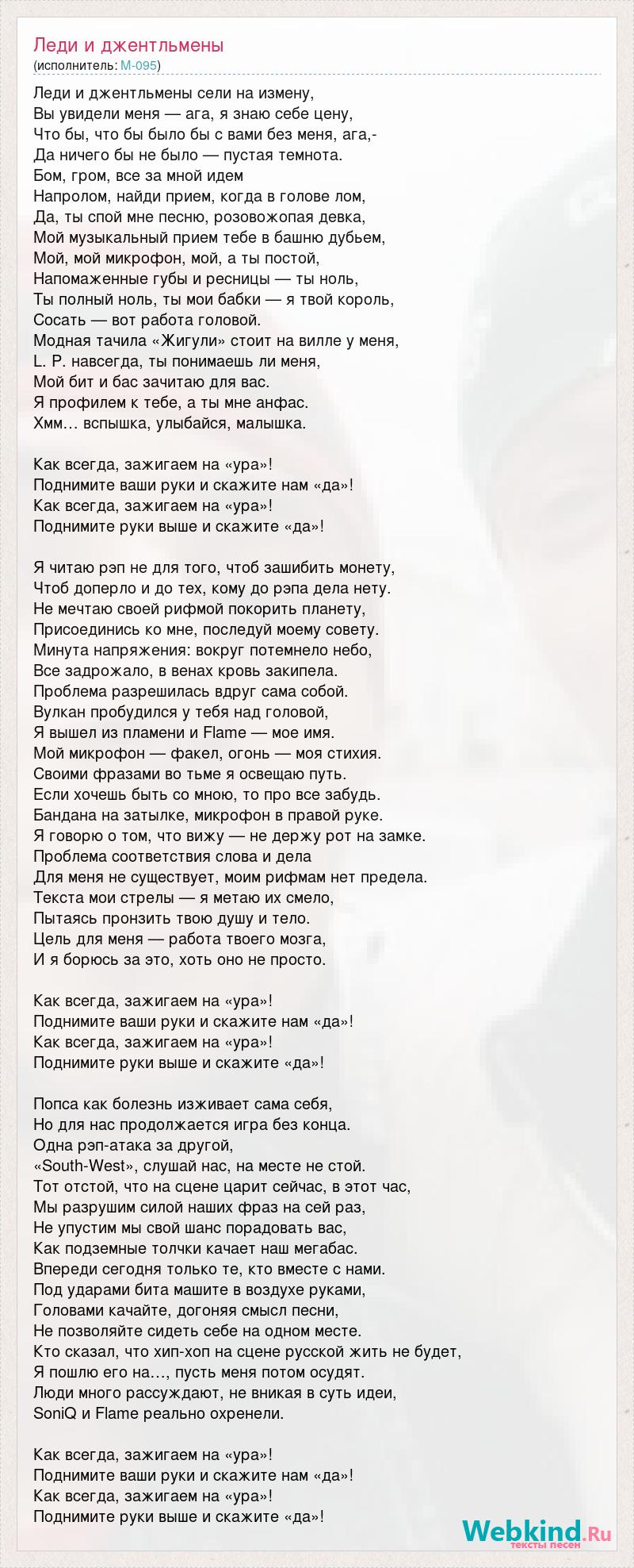 Леди и джентльмены сели на измену, Вы увидели меня — ага, я знаю себе цену, Что бы, что бы было бы с вами без меня, ага,- Да ничего бы не было — пустая темнота. Бом, гром, все за мной идем Напролом, найди прием, когда в голове лом, Да, ты спой мне песню, розовожопая девка, Мой музыкальный прием тебе в башню дубьем, Мой, мой микрофон, мой, а ты постой, Напомаженные губы и ресницы — ты ноль, Ты полный ноль, ты мои бабки — я твой король, Сосать — вот работа головой. Модная тачила «Жигули» стоит на вилле у меня, L. P. навсегда, ты понимаешь ли меня, Мой бит и бас зачитаю для вас. Я профилем к тебе, а ты мне анфас. Хмм… вспышка, улыбайся, малышка. Как всегда, зажигаем на «ура»! Поднимите ваши руки и скажите нам «да»! Как всегда, зажигаем на «ура»! Поднимите руки выше и скажите «да»! Я читаю рэп не для того, чтоб зашибить монету, Чтоб доперло и до тех, кому до рэпа дела нету. Не мечтаю своей рифмой покорить планету, Присоединись ко мне, последуй моему совету. Минута напряжения: вокруг потемнело небо, Все задрожало, в венах кровь закипела. Проблема разрешилась вдруг сама собой. Вулкан пробудился у тебя над головой, Я вышел из пламени и Flame — мое имя. Мой микрофон — факел, огонь — моя стихия. Своими фразами во тьме я освещаю путь. Если хочешь быть со мною, то про все забудь. Бандана на затылке, микрофон в правой руке. Я говорю о том, что вижу — не держу рот на замке. Проблема соответствия слова и дела Для меня не существует, моим рифмам нет предела. Текста мои стрелы — я метаю их смело, Пытаясь пронзить твою душу и тело. Цель для меня — работа твоего мозга, И я борюсь за это, хоть оно не просто. Как всегда, зажигаем на «ура»! Поднимите ваши руки и скажите нам «да»! Как всегда, зажигаем на «ура»! Поднимите руки выше и скажите «да»! Попса как болезнь изживает сама себя, Но для нас продолжается игра без конца. Одна рэп-атака за другой, «South-West», слушай нас, на месте не стой. Тот отстой, что на сцене царит сейчас, в этот час, Мы разрушим силой наших фраз на сей раз, Не упустим мы свой шанс порадовать вас, Как подземные толчки качает наш мегабас. Впереди сегодня только те, кто вместе с нами. Под ударами бита машите в воздухе руками, Головами качайте, догоняя смысл песни, Не позволяйте сидеть себе на одном месте. Кто сказал, что хип-хоп на сцене русской жить не будет, Я пошлю его на…, пусть меня потом осудят. Люди много рассуждают, не вникая в суть идеи, SoniQ и Flame реально охренели. Как всегда, зажигаем на «ура»! Поднимите ваши руки и скажите нам «да»! Как всегда, зажигаем на «ура»! Поднимите руки выше и скажите «да»!