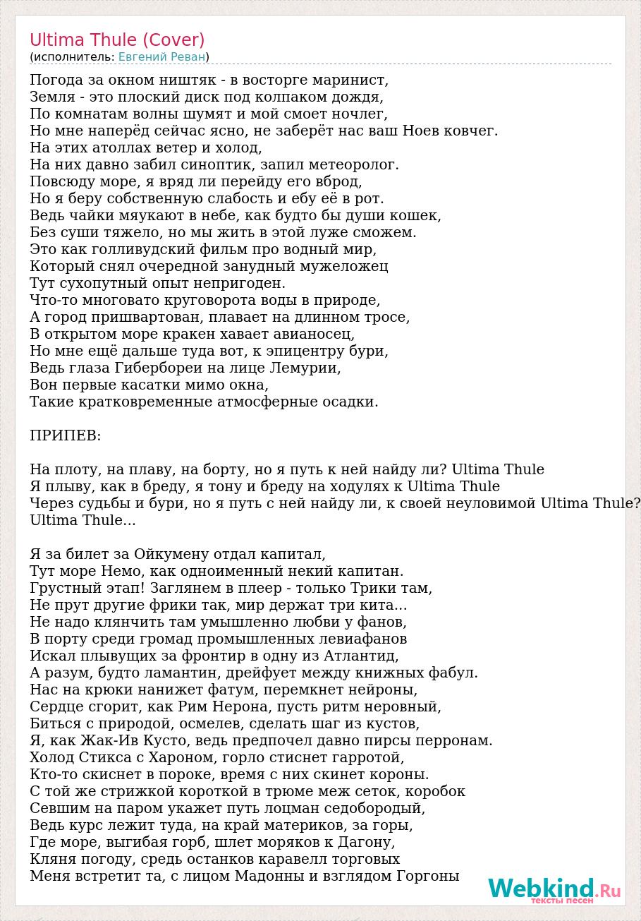 Погода за окном ништяк - в восторге маринист, Земля - это плоский диск под колпаком дождя, По комнатам волны шумят и мой смоет ночлег, Но мне наперёд сейчас ясно, не заберёт нас ваш Ноев ковчег. На этих атоллах ветер и холод, На них давно забил синоптик, запил метеоролог. Повсюду море, я вряд ли перейду его вброд, Но я беру собственную слабость и ебу её в рот. Ведь чайки мяукают в небе, как будто бы души кошек, Без суши тяжело, но мы жить в этой луже сможем. Это как голливудский фильм про водный мир, Который снял очередной занудный мужеложец Тут сухопутный опыт непригоден. Что-то многовато круговорота воды в природе, А город пришвартован, плавает на длинном тросе, В открытом море кракен хавает авианосец, Но мне ещё дальше туда вот, к эпицентру бури, Ведь глаза Гибербореи на лице Лемурии, Вон первые касатки мимо окна, Такие кратковременные атмосферные осадки. ПРИПЕВ: На плоту, на плаву, на борту, но я путь к ней найду ли? Ultima Thule Я плыву, как в бреду, я тону и бреду на ходулях к Ultima Thule Через судьбы и бури, но я путь с ней найду ли, к своей неуловимой Ultima Thule? Ultima Thule... Я за билет за Ойкумену отдал капитал, Тут море Немо, как одноименный некий капитан. Грустный этап! Заглянем в плеер - только Трики там, Не прут другие фрики так, мир держат три кита... Не надо клянчить там умышленно любви у фанов, В порту среди громад промышленных левиафанов Искал плывущих за фронтир в одну из Атлантид, А разум, будто ламантин, дрейфует между книжных фабул. Нас на крюки нанижет фатум, перемкнет нейроны, Сердце сгорит, как Рим Нерона, пусть ритм неровный, Биться с природой, осмелев, сделать шаг из кустов, Я, как Жак-Ив Кусто, ведь предпочел давно пирсы перронам. Холод Стикса с Хароном, горло стиснет гарротой, Кто-то скиснет в пороке, время с них скинет короны. С той же стрижкой короткой в трюме меж сеток, коробок Севшим на паром укажет путь лоцман седобородый, Ведь курс лежит туда, на край материков, за горы, Где море, выгибая горб, шлет моряков к Дагону, Кляня погоду, средь останков каравелл торговых Меня встретит та, с лицом Мадонны и взглядом Горгоны