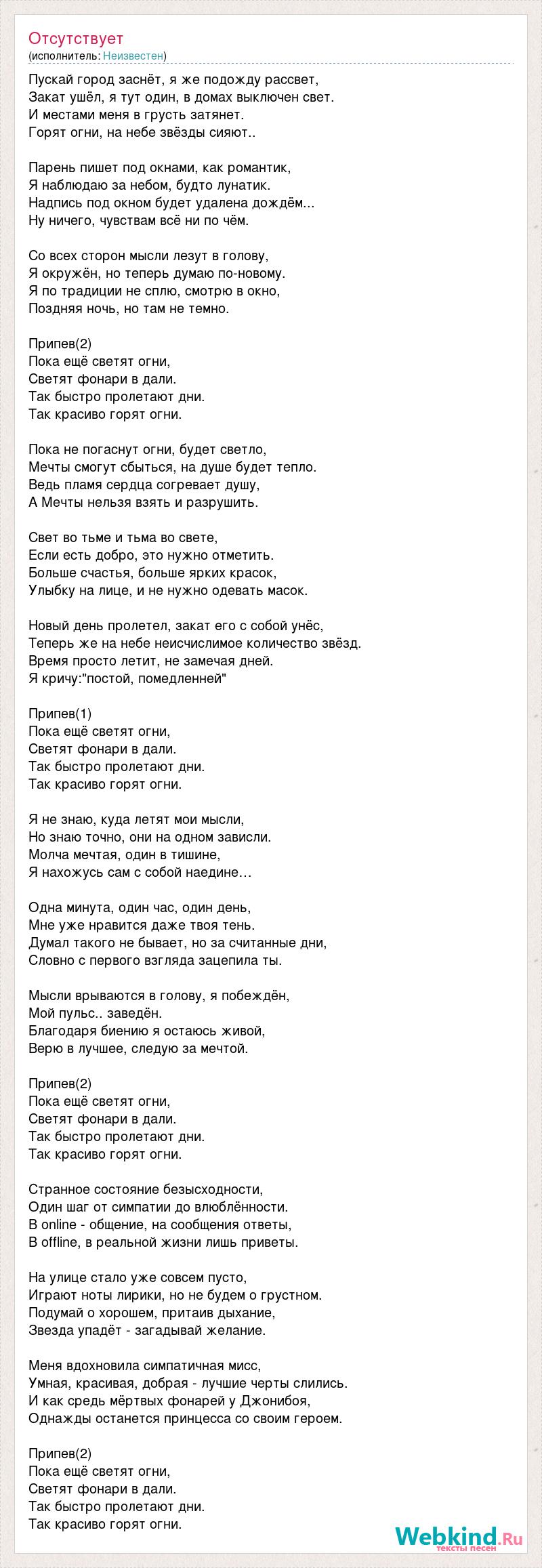 Пускай город заснёт, я же подожду рассвет, Закат ушёл, я тут один, в домах выключен свет. И местами меня в грусть затянет. Горят огни, на небе звёзды сияют.. Парень пишет под окнами, как романтик, Я наблюдаю за небом, будто лунатик. Надпись под окном будет удалена дождём... Ну ничего, чувствам всё ни по чём. Со всех сторон мысли лезут в голову, Я окружён, но теперь думаю по-новому. Я по традиции не сплю, смотрю в окно, Поздняя ночь, но там не темно. Припев(2) Пока ещё светят огни, Светят фонари в дали. Так быстро пролетают дни. Так красиво горят огни. Пока не погаснут огни, будет светло, Мечты смогут сбыться, на душе будет тепло. Ведь пламя сердца согревает душу, А Мечты нельзя взять и разрушить. Свет во тьме и тьма во свете, Если есть добро, это нужно отметить. Больше счастья, больше ярких красок, Улыбку на лице, и не нужно одевать масок. Новый день пролетел, закат его с собой унёс, Теперь же на небе неисчислимое количество звёзд. Время просто летит, не замечая дней. Я кричу:"постой, помедленней" Припев(1) Пока ещё светят огни, Светят фонари в дали. Так быстро пролетают дни. Так красиво горят огни. Я не знаю, куда летят мои мысли, Но знаю точно, они на одном зависли. Молча мечтая, один в тишине, Я нахожусь сам с собой наедине… Одна минута, один час, один день, Мне уже нравится даже твоя тень. Думал такого не бывает, но за считанные дни, Словно с первого взгляда зацепила ты. Мысли врываются в голову, я побеждён, Мой пульс.. заведён. Благодаря биению я остаюсь живой, Верю в лучшее, следую за мечтой. Припев(2) Пока ещё светят огни, Светят фонари в дали. Так быстро пролетают дни. Так красиво горят огни. Странное состояние безысходности, Один шаг от симпатии до влюблённости. В online - общение, на сообщения ответы, В offline, в реальной жизни лишь приветы. На улице стало уже совсем пусто, Играют ноты лирики, но не будем о грустном. Подумай о хорошем, притаив дыхание, Звезда упадёт - загадывай желание. Меня вдохновила симпатичная мисс, Умная, красивая, добрая - лучшие черты слились. И как средь мёртвых фонарей у Джонибоя, Однажды останется принцесса со своим героем. Припев(2) Пока ещё светят огни, Светят фонари в дали. Так быстро пролетают дни. Так красиво горят огни.