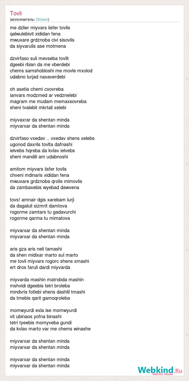 me dzlier miyvars iisfer tovlis qalwulebivit xididan fena mwuxare grdznoba civi sisovlis da siyvarulis ase motmena dzvirfaso suli mevseba tovlit dgeebi rbian da me vberdebi chems samshobloshi me movle mxolod udabno lurjad naxaverdebi oh asetia chemi cxovreba ianvars modzmed ar vedznelebi magram me mudam memaxsovreba sheni tvalebit mkrtali xelebi miyvaxrar da shentan minda miyvarxar da shentan minda dzvirfaso vxedav .. vxedav shens xelebs ugonod daxrils tovlta dafnashi ielvebs hqreba da kvlav ielvebs sheni mandili am udabnoshi amitom miyvars iisfer tovlis chveni mdinaris xididan fena mwuxare grdznoba qrolis mimovlis da zambaxebis wyebad dawvena tovs! amnair dgis xarebam lurji da dagaluli sizmrit damtova rogorme zamtars tu gadavurchi rogorme qarma tu mimatova miyvarxar da shentan minda miyvarxar da shentan minda aris gza aris neli tamashi da shen midixar marto sul marto me tovli miyvars rogorc shens xmashi ert dros faruli dardi miyvarda miyvarda mashin matrobda mashin mshvidi dgeebis tetri broleba mindvris fotlebi shens dashlil tmashi da tmebis qarit gamoqroleba momwyurdi exla ise momwyurdi vit ubinaos yofna binashi tetri tyeebis momyveba gundi da kvlav marto var me chems winashe miyvarxar da shentan minda miyvarxar da shentan minda miyvarxar da shentan minda miyvarxar da shentan minda