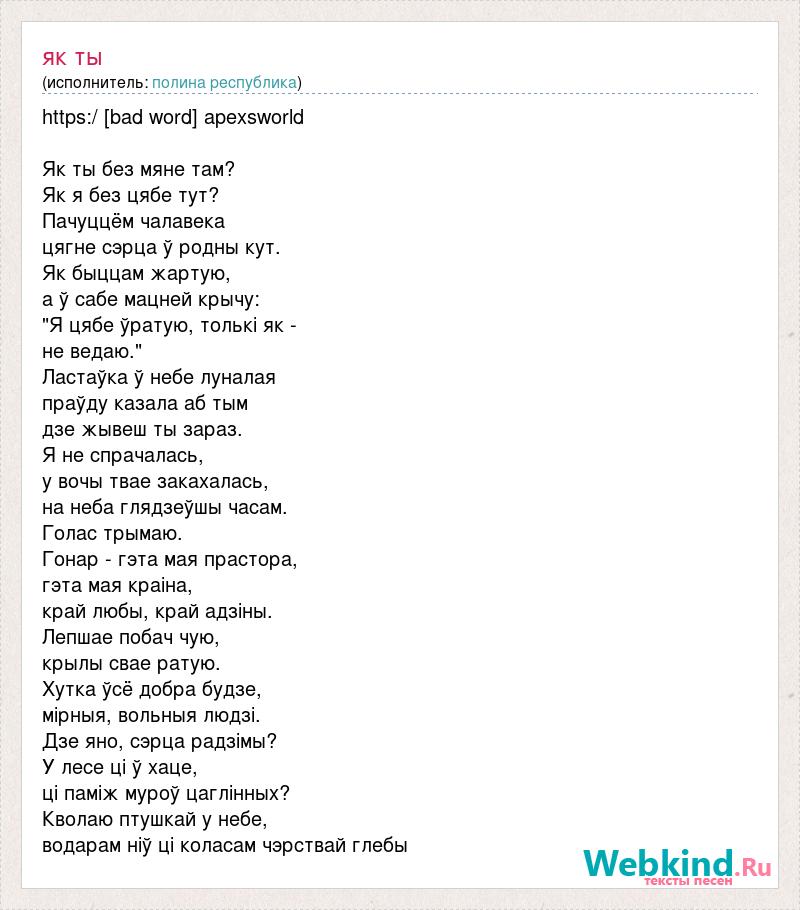 https:/ [bad word] apexsworld Як ты без мяне там? Як я без цябе тут? Пачуццём чалавека цягне сэрца ў родны кут. Як быццам жартую, а ў сабе мацней крычу: "Я цябе ўратую, толькі як - не ведаю." Ластаўка ў небе луналая праўду казала аб тым дзе жывеш ты зараз. Я не спрачалась, у вочы твае закахалась, на неба глядзеўшы часам. Голас трымаю. Гонар - гэта мая прастора, гэта мая краіна, край любы, край адзіны. Лепшае побач чую, крылы свае ратую. Хутка ўсё добра будзе, мірныя, вольныя людзі. Дзе яно, сэрца радзімы? У лесе ці ў хаце, ці паміж муроў цаглінных? Кволаю птушкай у небе, водарам ніў ці коласам чэрствай глебы