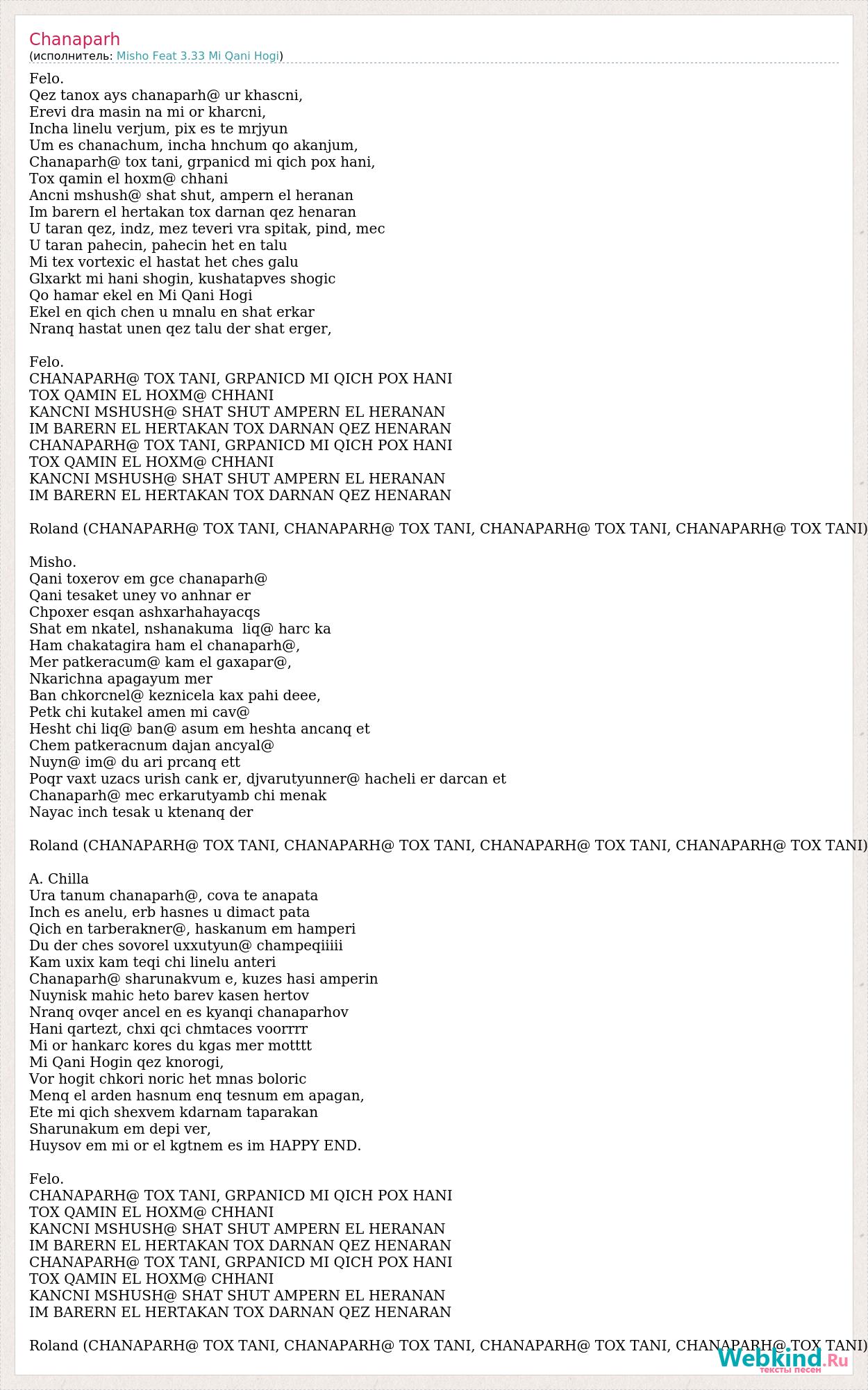 Felo. Qez tanox ays chanaparh@ ur khascni, Erevi dra masin na mi or kharcni, Incha linelu verjum, pix es te mrjyun Um es chanachum, incha hnchum qo akanjum, Chanaparh@ tox tani, grpanicd mi qich pox hani, Tox qamin el hoxm@ chhani Ancni mshush@ shat shut, ampern el heranan Im barern el hertakan tox darnan qez henaran U taran qez, indz, mez teveri vra spitak, pind, mec U taran pahecin, pahecin het en talu Mi tex vortexic el hastat het ches galu Glxarkt mi hani shogin, kushatapves shogic Qo hamar ekel en Mi Qani Hogi Ekel en qich chen u mnalu en shat erkar Nranq hastat unen qez talu der shat erger, Felo. CHANAPARH@ TOX TANI, GRPANICD MI QICH POX HANI TOX QAMIN EL HOXM@ CHHANI KANCNI MSHUSH@ SHAT SHUT AMPERN EL HERANAN IM BARERN EL HERTAKAN TOX DARNAN QEZ HENARAN CHANAPARH@ TOX TANI, GRPANICD MI QICH POX HANI TOX QAMIN EL HOXM@ CHHANI KANCNI MSHUSH@ SHAT SHUT AMPERN EL HERANAN IM BARERN EL HERTAKAN TOX DARNAN QEZ HENARAN Roland (CHANAPARH@ TOX TANI, CHANAPARH@ TOX TANI, CHANAPARH@ TOX TANI, CHANAPARH@ TOX TANI) Misho. Qani toxerov em gce chanaparh@ Qani tesaket uney vo anhnar er Chpoxer esqan ashxarhahayacqs Shat em nkatel, nshanakuma liq@ harc ka Ham chakatagira ham el chanaparh@, Mer patkeracum@ kam el gaxapar@, Nkarichna apagayum mer Ban chkorcnel@ keznicela kax pahi deee, Petk chi kutakel amen mi cav@ Hesht chi liq@ ban@ asum em heshta ancanq et Chem patkeracnum dajan ancyal@ Nuyn@ im@ du ari prcanq ett Poqr vaxt uzacs urish cank er, djvarutyunner@ hacheli er darcan et Chanaparh@ mec erkarutyamb chi menak Nayac inch tesak u ktenanq der Roland (CHANAPARH@ TOX TANI, CHANAPARH@ TOX TANI, CHANAPARH@ TOX TANI, CHANAPARH@ TOX TANI) A. Chilla Ura tanum chanaparh@, cova te anapata Inch es anelu, erb hasnes u dimact pata Qich en tarberakner@, haskanum em hamperi Du der ches sovorel uxxutyun@ champeqiiiii Kam uxix kam teqi chi linelu anteri Chanaparh@ sharunakvum e, kuzes hasi amperin Nuynisk mahic heto barev kasen hertov Nranq ovqer ancel en es kyanqi chanaparhov Hani qartezt, chxi qci chmtaces voorrrr Mi or hankarc kores du kgas mer motttt Mi Qani Hogin qez knorogi, Vor hogit chkori noric het mnas boloric Menq el arden hasnum enq tesnum em apagan, Ete mi qich shexvem kdarnam taparakan Sharunakum em depi ver, Huysov em mi or el kgtnem es im HAPPY END. Felo. CHANAPARH@ TOX TANI, GRPANICD MI QICH POX HANI TOX QAMIN EL HOXM@ CHHANI KANCNI MSHUSH@ SHAT SHUT AMPERN EL HERANAN IM BARERN EL HERTAKAN TOX DARNAN QEZ HENARAN CHANAPARH@ TOX TANI, GRPANICD MI QICH POX HANI TOX QAMIN EL HOXM@ CHHANI KANCNI MSHUSH@ SHAT SHUT AMPERN EL HERANAN IM BARERN EL HERTAKAN TOX DARNAN QEZ HENARAN Roland (CHANAPARH@ TOX TANI, CHANAPARH@ TOX TANI, CHANAPARH@ TOX TANI, CHANAPARH@ TOX TANI)