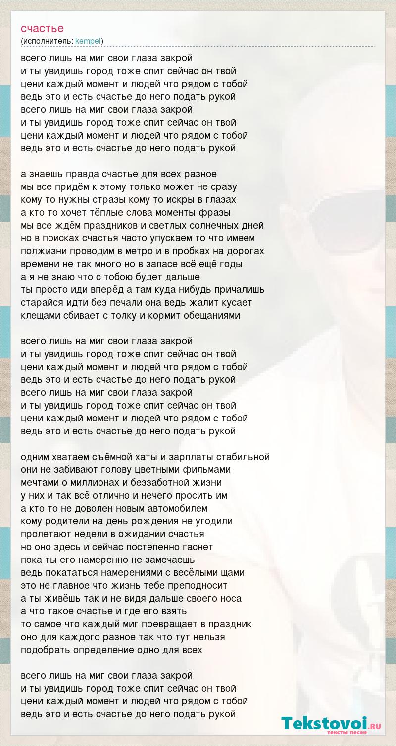 всего лишь на миг свои глаза закрой и ты увидишь город тоже спит сейчас он твой цени каждый момент и людей что рядом с тобой ведь это и есть счастье до него подать рукой всего лишь на миг свои глаза закрой и ты увидишь город тоже спит сейчас он твой цени каждый момент и людей что рядом с тобой ведь это и есть счастье до него подать рукой а знаешь правда счастье для всех разное мы все придём к этому только может не сразу кому то нужны стразы кому то искры в глазах а кто то хочет тёплые слова моменты фразы мы все ждём праздников и светлых солнечных дней но в поисках счастья часто упускаем то что имеем полжизни проводим в метро и в пробках на дорогах времени не так много но в запасе всё ещё годы а я не знаю что с тобою будет дальше ты просто иди вперёд а там куда нибудь причалишь старайся идти без печали она ведь жалит кусает клещами сбивает с толку и кормит обещаниями всего лишь на миг свои глаза закрой и ты увидишь город тоже спит сейчас он твой цени каждый момент и людей что рядом с тобой ведь это и есть счастье до него подать рукой всего лишь на миг свои глаза закрой и ты увидишь город тоже спит сейчас он твой цени каждый момент и людей что рядом с тобой ведь это и есть счастье до него подать рукой одним хватаем съёмной хаты и зарплаты стабильной они не забивают голову цветными фильмами мечтами о миллионах и беззаботной жизни у них и так всё отлично и нечего просить им а кто то не доволен новым автомобилем кому родители на день рождения не угодили пролетают недели в ожидании счастья но оно здесь и сейчас постепенно гаснет пока ты его намеренно не замечаешь ведь покататься намерениями с весёлыми щами это не главное что жизнь тебе преподносит а ты живёшь так и не видя дальше своего носа а что такое счастье и где его взять то самое что каждый миг превращает в праздник оно для каждого разное так что тут нельзя подобрать определение одно для всех всего лишь на миг свои глаза закрой и ты увидишь город тоже спит сейчас он твой цени каждый момент и людей что рядом с тобой ведь это и есть счастье до него подать рукой