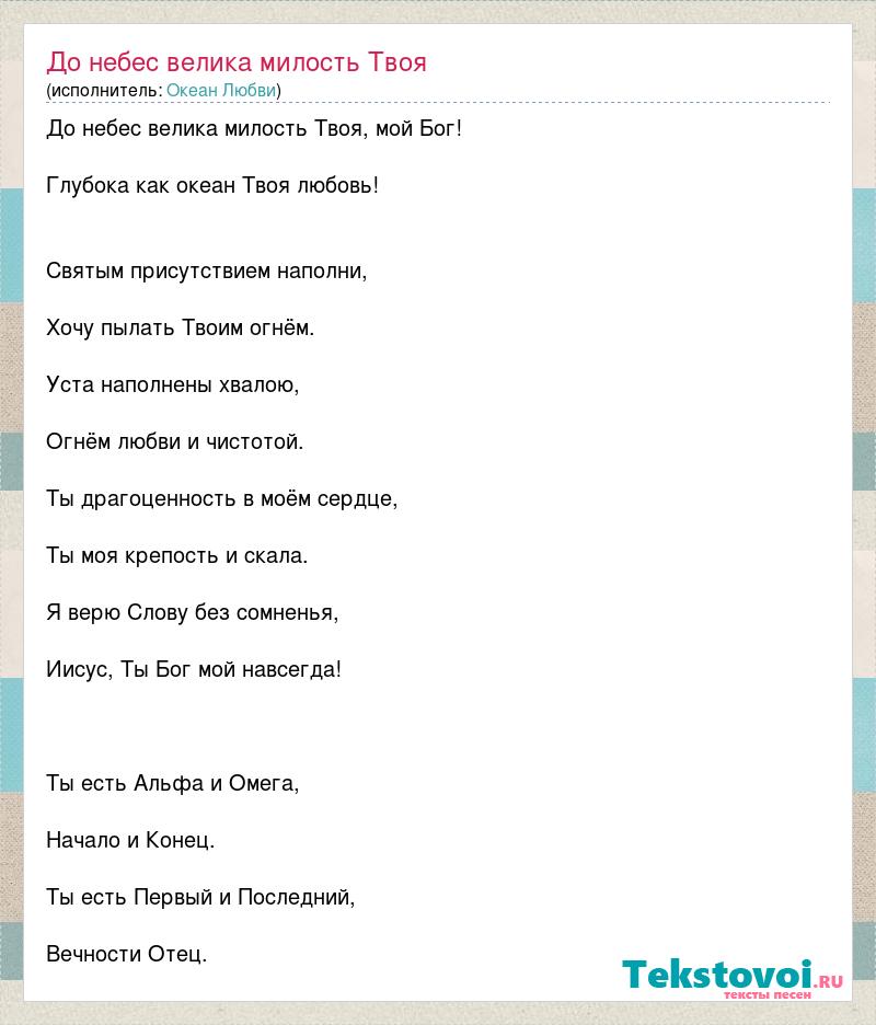 До небес велика милость Твоя, мой Бог! Глубока как океан Твоя любовь! Святым присутствием наполни, Хочу пылать Твоим огнём. Уста наполнены хвалою, Огнём любви и чистотой. Ты драгоценность в моём сердце, Ты моя крепость и скала. Я верю Слову без сомненья, Иисус, Ты Бог мой навсегда! Ты есть Альфа и Омега, Начало и Конец. Ты есть Первый и Последний, Вечности Отец.