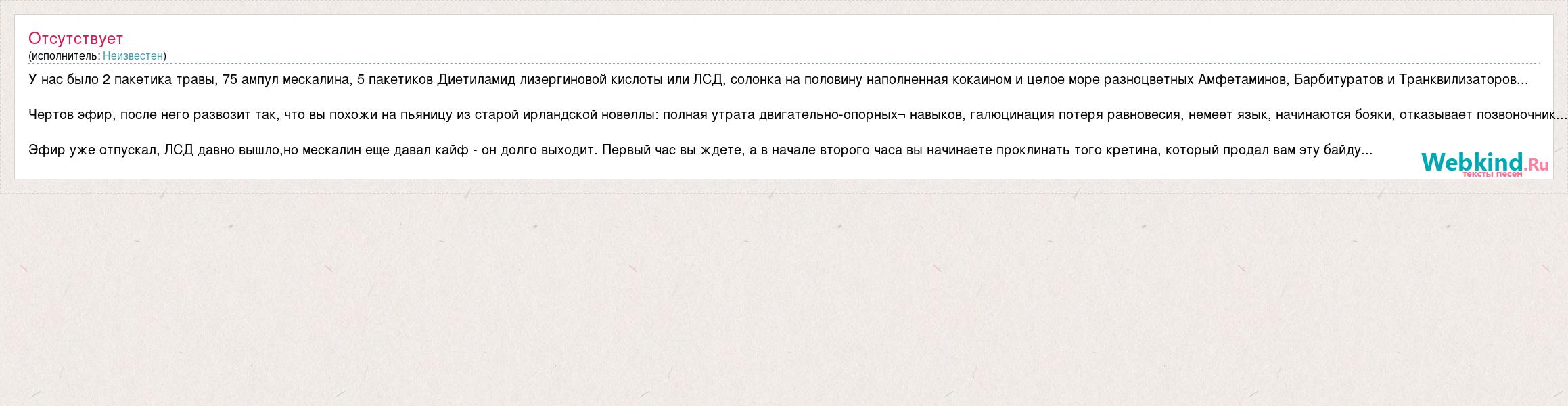 Главная→Исполнители→Неизвестен→У нас было 2 пакетика травы, 75 ампул мескалина, 5 пакетиков Диетиламид лизергин