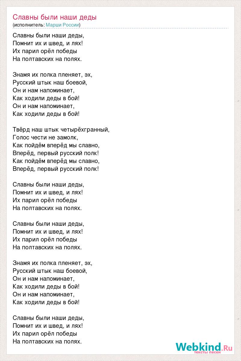 Славны были наши деды, Помнит их и швед, и лях! Их парил орёл победы На полтавских на полях. Знамя их полка пленяет, эх, Русский штык наш боевой, Он и нам напоминает, Как ходили деды в бой! Он и нам напоминает, Как ходили деды в бой! Твёрд наш штык четырёхгранный, Голос чести не замолк, Как пойдём вперёд мы славно, Вперёд, первый русский полк! Как пойдём вперёд мы славно, Вперёд, первый русский полк! Славны были наши деды, Помнит их и швед, и лях! Их парил орёл победы На полтавских на полях. Славны были наши деды, Помнит их и швед, и лях! Их парил орёл победы На полтавских на полях. Знамя их полка пленяет, эх, Русский штык наш боевой, Он и нам напоминает, Как ходили деды в бой! Он и нам напоминает, Как ходили деды в бой! Славны были наши деды, Помнит их и швед, и лях! Их парил орёл победы На полтавских на полях.