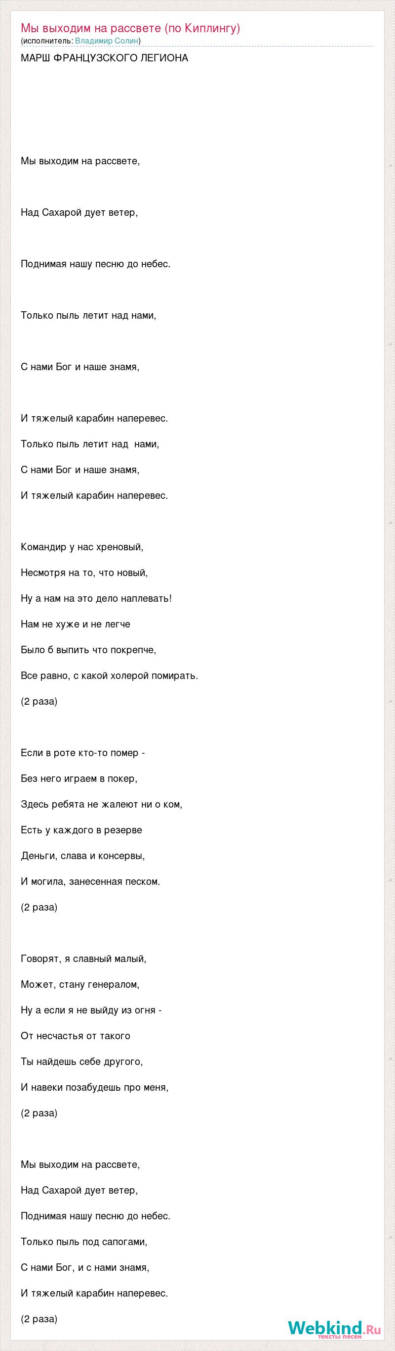 МАРШ ФРАНЦУЗСКОГО ЛЕГИОНА Мы выходим на рассвете, Над Сахарой дует ветер, Поднимая нашу песню до небес. Только пыль летит над нами, С нами Бог и наше знамя, И тяжелый карабин наперевес. Только пыль летит над нами, С нами Бог и наше знамя, И тяжелый карабин наперевес. Командир у нас хреновый, Несмотря на то, что новый, Ну а нам на это дело наплевать! Нам не хуже и не легче Было б выпить что покрепче, Все равно, с какой холерой помирать. (2 раза) Если в роте кто-то помер - Без него играем в покер, Здесь ребята не жалеют ни о ком, Есть у каждого в резерве Деньги, слава и консервы, И могила, занесенная песком. (2 раза) Говорят, я славный малый, Может, стану генералом, Ну а если я не выйду из огня - От несчастья от такого Ты найдешь себе другого, И навеки позабудешь про меня, (2 раза) Мы выходим на рассвете, Над Сахарой дует ветер, Поднимая нашу песню до небес. Только пыль под сапогами, С нами Бог, и с нами знамя, И тяжелый карабин наперевес. (2 раза)