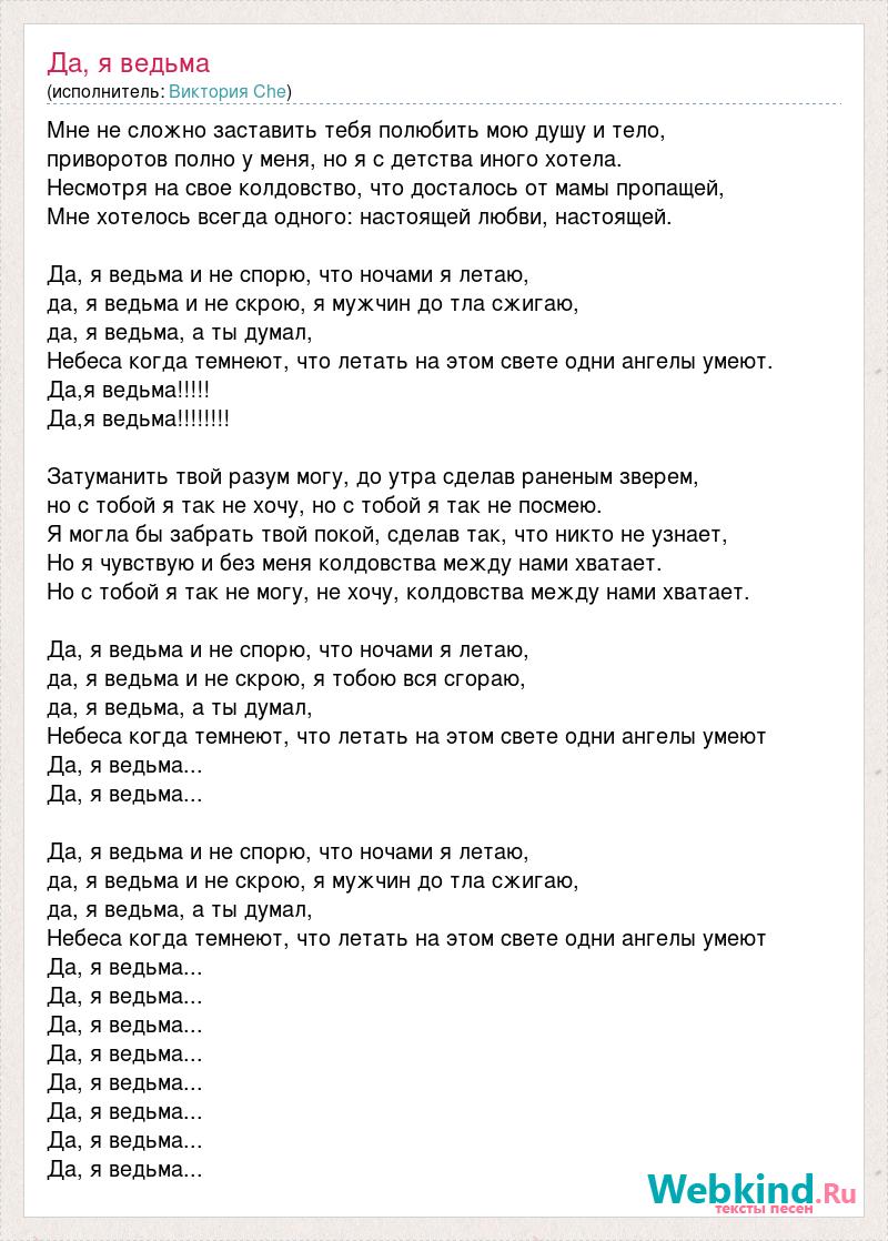 Мне не сложно заставить тебя полюбить мою душу и тело, приворотов полно у меня, но я с детства иного хотела. Несмотря на свое колдовство, что досталось от мамы пропащей, Мне хотелось всегда одного: настоящей любви, настоящей. Да, я ведьма и не спорю, что ночами я летаю, да, я ведьма и не скрою, я мужчин до тла сжигаю, да, я ведьма, а ты думал, Небеса когда темнеют, что летать на этом свете одни ангелы умеют. Да,я ведьма!!!!! Да,я ведьма!!!!!!!! Затуманить твой разум могу, до утра сделав раненым зверем, но с тобой я так не хочу, но с тобой я так не посмею. Я могла бы забрать твой покой, сделав так, что никто не узнает, Но я чувствую и без меня колдовства между нами хватает. Но с тобой я так не могу, не хочу, колдовства между нами хватает. Да, я ведьма и не спорю, что ночами я летаю, да, я ведьма и не скрою, я тобою вся сгораю, да, я ведьма, а ты думал, Небеса когда темнеют, что летать на этом свете одни ангелы умеют Да, я ведьма... Да, я ведьма... Да, я ведьма и не спорю, что ночами я летаю, да, я ведьма и не скрою, я мужчин до тла сжигаю, да, я ведьма, а ты думал, Небеса когда темнеют, что летать на этом свете одни ангелы умеют Да, я ведьма... Да, я ведьма... Да, я ведьма... Да, я ведьма... Да, я ведьма... Да, я ведьма... Да, я ведьма... Да, я ведьма...