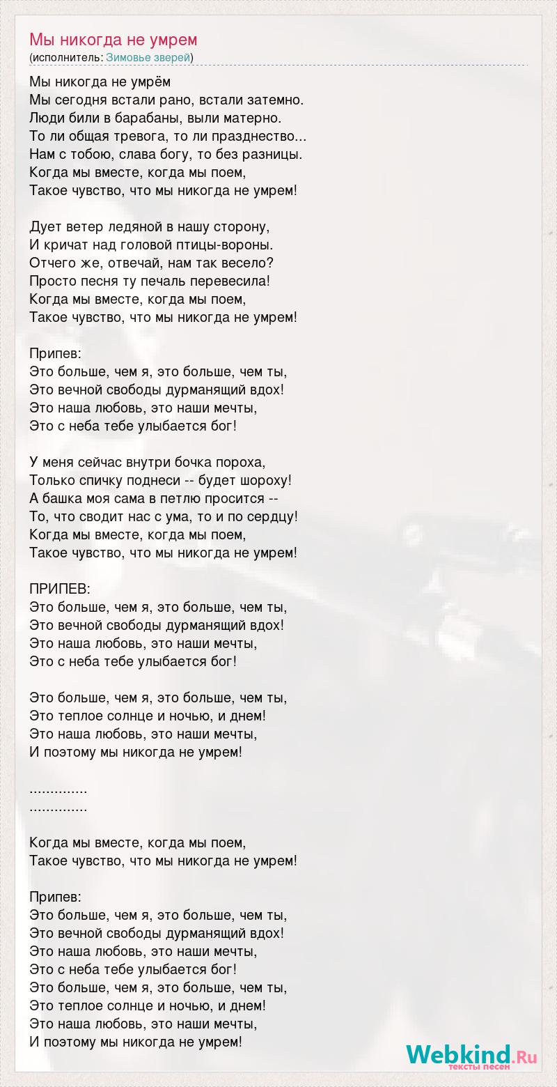 Мы никогда не умрём Мы сегодня встали рано, встали затемно. Люди били в барабаны, выли матерно. То ли общая тревога, то ли празднество... Нам с тобою, слава богу, то без разницы. Когда мы вместе, когда мы поем, Такое чувство, что мы никогда не умрем! Дует ветер ледяной в нашу сторону, И кричат над головой птицы-вороны. Отчего же, отвечай, нам так весело? Просто песня ту печаль перевесила! Когда мы вместе, когда мы поем, Такое чувство, что мы никогда не умрем! Припев: Это больше, чем я, это больше, чем ты, Это вечной свободы дурманящий вдох! Это наша любовь, это наши мечты, Это с неба тебе улыбается бог! У меня сейчас внутри бочка пороха, Только спичку поднеси -- будет шороху! А башка моя сама в петлю просится -- То, что сводит нас с ума, то и по сердцу! Когда мы вместе, когда мы поем, Такое чувство, что мы никогда не умрем! ПРИПЕВ: Это больше, чем я, это больше, чем ты, Это вечной свободы дурманящий вдох! Это наша любовь, это наши мечты, Это с неба тебе улыбается бог! Это больше, чем я, это больше, чем ты, Это теплое солнце и ночью, и днем! Это наша любовь, это наши мечты, И поэтому мы никогда не умрем! .............. .............. Когда мы вместе, когда мы поем, Такое чувство, что мы никогда не умрем! Припев: Это больше, чем я, это больше, чем ты, Это вечной свободы дурманящий вдох! Это наша любовь, это наши мечты, Это с неба тебе улыбается бог! Это больше, чем я, это больше, чем ты, Это теплое солнце и ночью, и днем! Это наша любовь, это наши мечты, И поэтому мы никогда не умрем!