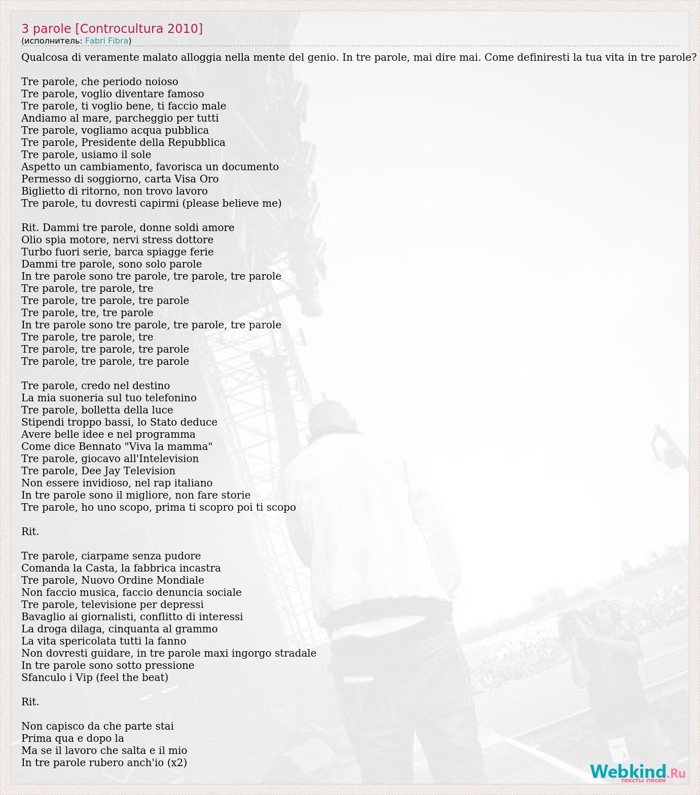 Qualcosa di veramente malato alloggia nella mente del genio. In tre parole, mai dire mai. Come definiresti la tua vita in tre parole? Tre parole, che periodo noioso Tre parole, voglio diventare famoso Tre parole, ti voglio bene, ti faccio male Andiamo al mare, parcheggio per tutti Tre parole, vogliamo acqua pubblica Tre parole, Presidente della Repubblica Tre parole, usiamo il sole Aspetto un cambiamento, favorisca un documento Permesso di soggiorno, carta Visa Oro Biglietto di ritorno, non trovo lavoro Tre parole, tu dovresti capirmi (please believe me) Rit. Dammi tre parole, donne soldi amore Olio spia motore, nervi stress dottore Turbo fuori serie, barca spiagge ferie Dammi tre parole, sono solo parole In tre parole sono tre parole, tre parole, tre parole Tre parole, tre parole, tre Tre parole, tre parole, tre parole Tre parole, tre, tre parole In tre parole sono tre parole, tre parole, tre parole Tre parole, tre parole, tre Tre parole, tre parole, tre parole Tre parole, tre parole, tre parole Tre parole, credo nel destino La mia suoneria sul tuo telefonino Tre parole, bolletta della luce Stipendi troppo bassi, lo Stato deduce Avere belle idee e nel programma Come dice Bennato "Viva la mamma" Tre parole, giocavo all'Intelevision Tre parole, Dee Jay Television Non essere invidioso, nel rap italiano In tre parole sono il migliore, non fare storie Tre parole, ho uno scopo, prima ti scopro poi ti scopo Rit. Tre parole, ciarpame senza pudore Comanda la Casta, la fabbrica incastra Tre parole, Nuovo Ordine Mondiale Non faccio musica, faccio denuncia sociale Tre parole, televisione per depressi Bavaglio ai giornalisti, conflitto di interessi La droga dilaga, cinquanta al grammo La vita spericolata tutti la fanno Non dovresti guidare, in tre parole maxi ingorgo stradale In tre parole sono sotto pressione Sfanculo i Vip (feel the beat) Rit. Non capisco da che parte stai Prima qua e dopo la Ma se il lavoro che salta e il mio In tre parole rubero anch'io (x2)