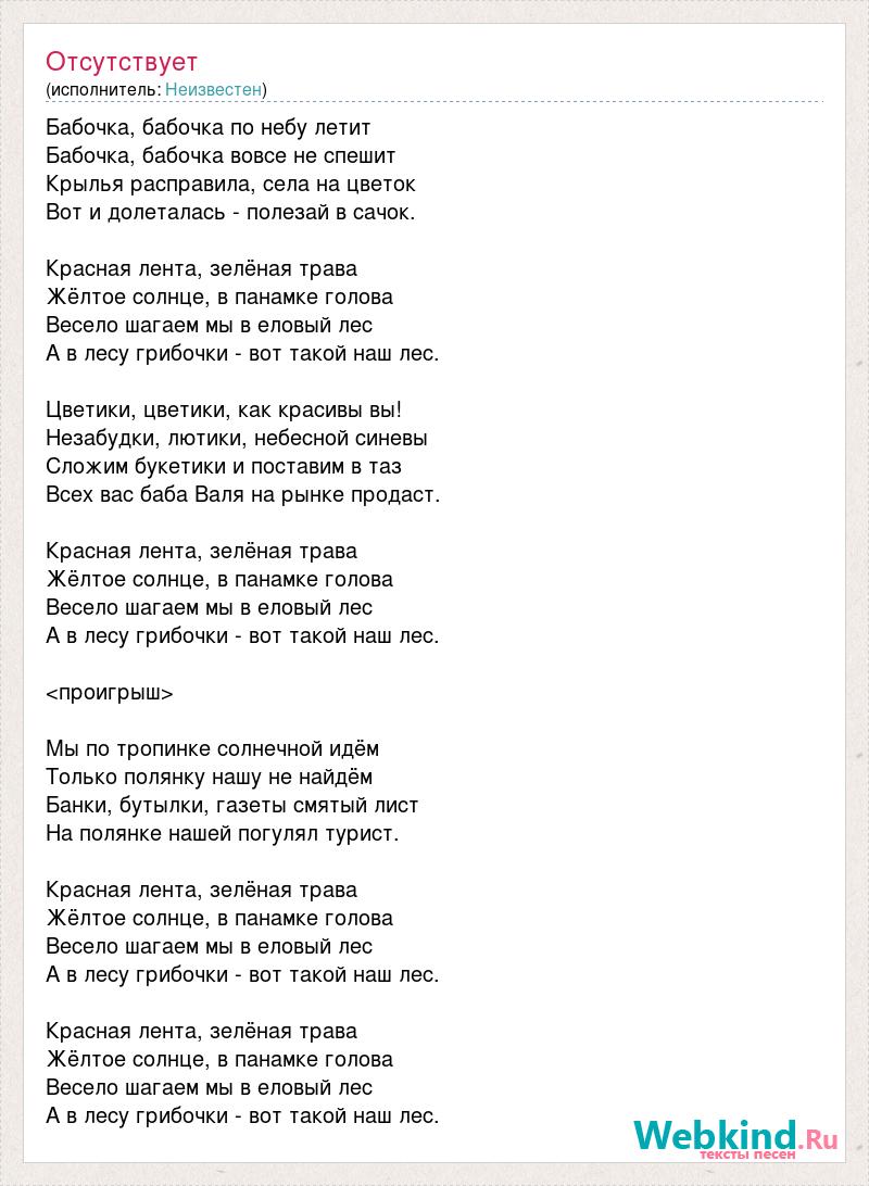 Бабочка, бабочка по небу летит Бабочка, бабочка вовсе не спешит Крылья расправила, села на цветок Вот и долеталась - полезай в сачок. Красная лента, зелёная трава Жёлтое солнце, в панамке голова Весело шагаем мы в еловый лес А в лесу грибочки - вот такой наш лес. Цветики, цветики, как красивы вы! Незабудки, лютики, небесной синевы Сложим букетики и поставим в таз Всех вас баба Валя на рынке продаст. Красная лента, зелёная трава Жёлтое солнце, в панамке голова Весело шагаем мы в еловый лес А в лесу грибочки - вот такой наш лес. <проигрыш> Мы по тропинке солнечной идём Только полянку нашу не найдём Банки, бутылки, газеты смятый лист На полянке нашей погулял турист. Красная лента, зелёная трава Жёлтое солнце, в панамке голова Весело шагаем мы в еловый лес А в лесу грибочки - вот такой наш лес. Красная лента, зелёная трава Жёлтое солнце, в панамке голова Весело шагаем мы в еловый лес А в лесу грибочки - вот такой наш лес.