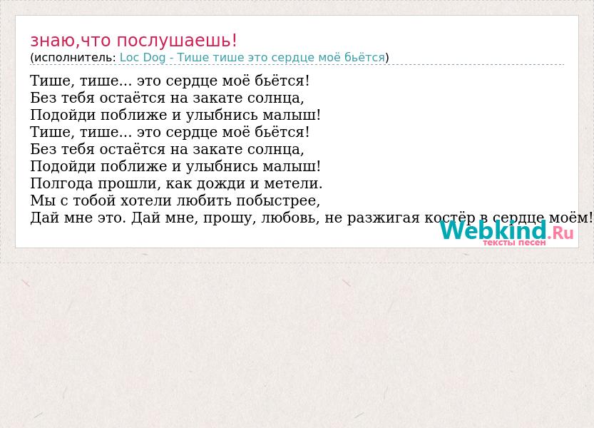 Тише, тише... это сердце моё бьётся! Без тебя остаётся на закате солнца, Подойди поближе и улыбнись малыш! Тише, тише... это сердце моё бьётся! Без тебя остаётся на закате солнца, Подойди поближе и улыбнись малыш! Полгода прошли, как дожди и метели. Мы с тобой хотели любить побыстрее, Дай мне это. Дай мне, прошу, любовь, не разжигая костёр в сердце моём!