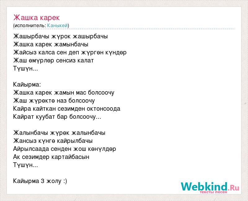 Жашырбачы жүрок жашырбачы Жашка карек жамынбачы Жайсыз калса сен деп жүргөн күндөр Жаш өмүрлөр сенсиз калат Түшүн... Кайырма: Жашка карек жамын мас болсоочу Жаш жүрөктө наз болсоочу Кайра кайткан сезимден октонсоода Кайрат куубат бар болсоочу... Жалынбачы жүрөк жалынбачы Жансыз күнгө кайрылбачы Айрылсаада сенден жош көнүлдөр Ак сезимдер картайбасын Түшүн... Кайырма 3 жолу :)