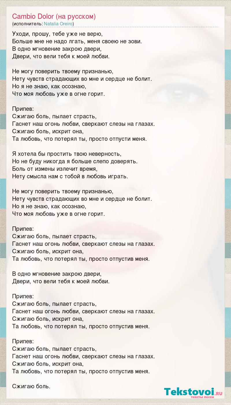 Уходи, прошу, тебе уже не верю, Больше мне не надо лгать, меня своею не зови. В одно мгновение закрою двери, Двери, что вели тебя к моей любви. Не могу поверить твоему признанью, Нету чувств страдающих во мне и сердце не болит. Но я не знаю, как осознаю, Что моя любовь уже в огне горит. Припев: Сжигаю боль, пылает страсть, Гаснет наш огонь любви, сверкают слезы на глазах. Сжигаю боль, искрит она, Та любовь, что потерял ты, просто отпусти меня. Я хотела бы простить твою неверность, Но не буду никогда я больше слепо доверять. Боль от измены излечит время, Нету смысла нам с тобой в любовь играть. Не могу поверить твоему признанью, Нету чувств страдающих во мне и сердце не болит. Но я не знаю, как осознаю, Что моя любовь уже в огне горит. Припев: Сжигаю боль, пылает страсть, Гаснет наш огонь любви, сверкают слезы на глазах. Сжигаю боль, искрит она, Та любовь, что потерял ты, просто отпустив меня. В одно мгновение закрою двери, Двери, что вели тебя к моей любви. Припев: Сжигаю боль, пылает страсть, Гаснет наш огонь любви, сверкают слезы на глазах. Сжигаю боль, искрит она, Та любовь, что потерял ты, просто отпустив меня. Припев: Сжигаю боль, пылает страсть, Гаснет наш огонь любви, сверкают слезы на глазах. Сжигаю боль, искрит она, Та любовь, что потерял ты, просто отпустив меня. Сжигаю боль.