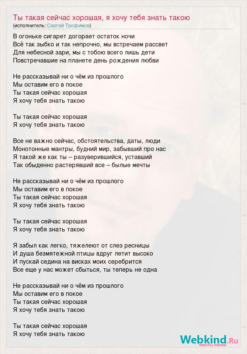 В огоньке сигарет догорает остаток ночи Всё так зыбко и так непрочно, мы встречаем рассвет Для небесной зари, мы с тобою всего лишь дети Повстречавшие на планете день рождения любви Не рассказывай ни о чём из прошлого Мы оставим его в покое Ты такая сейчас хорошая Я хочу тебя знать такою Ты такая сейчас хорошая Я хочу тебя знать такою Все не важно сейчас, обстоятельства, даты, люди Монотонные мантры, будний мир, забывший про нас Я такой же как ты – разуверившийся, уставший Так обыденно растерявший все – былые мечты Не рассказывай ни о чём из прошлого Мы оставим его в покое Ты такая сейчас хорошая Я хочу тебя знать такою Ты такая сейчас хорошая Я хочу тебя знать такою Я забыл как легко, тяжелеют от слез ресницы И душа безмятежной птицы вдруг летит высоко И пускай седина на висках моих серебрится Все еще у нас может сбыться, ты теперь не одна Не рассказывай ни о чём из прошлого Мы оставим его в покое Ты такая сейчас хорошая Я хочу тебя знать такою Ты такая сейчас хорошая Я хочу тебя знать такою