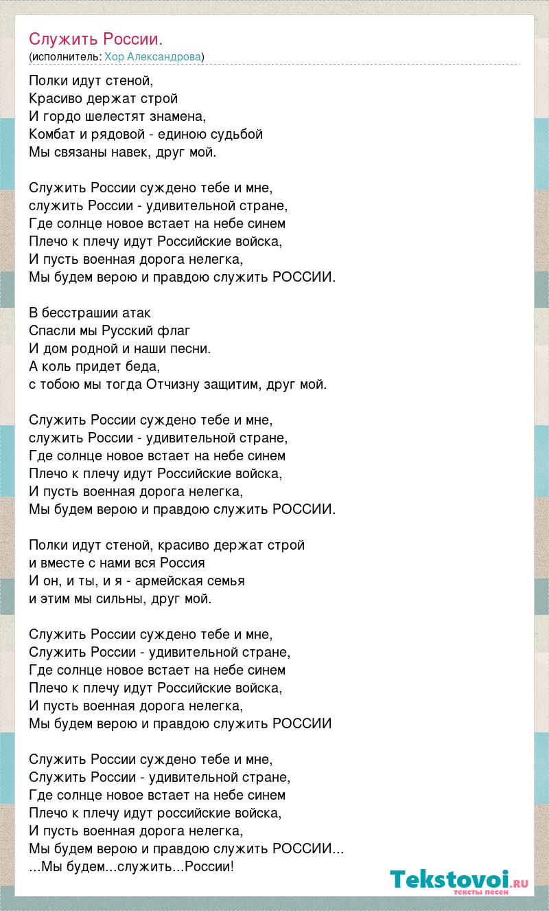 Полки идут стеной, Красиво держат строй И гордо шелестят знамена, Комбат и рядовой - единою судьбой Мы связаны навек, друг мой. Служить России суждено тебе и мне, служить России - удивительной стране, Где солнце новое встает на небе синем Плечо к плечу идут Российские войска, И пусть военная дорога нелегка, Мы будем верою и правдою служить РОССИИ. В бесстрашии атак Спасли мы Русский флаг И дом родной и наши песни. А коль придет беда, с тобою мы тогда Отчизну защитим, друг мой. Служить России суждено тебе и мне, служить России - удивительной стране, Где солнце новое встает на небе синем Плечо к плечу идут Российские войска, И пусть военная дорога нелегка, Мы будем верою и правдою служить РОССИИ. Полки идут стеной, красиво держат строй и вместе с нами вся Россия И он, и ты, и я - армейская семья и этим мы сильны, друг мой. Служить России суждено тебе и мне, Служить России - удивительной стране, Где солнце новое встает на небе синем Плечо к плечу идут Российские войска, И пусть военная дорога нелегка, Мы будем верою и правдою служить РОССИИ Служить России суждено тебе и мне, Служить России - удивительной стране, Где солнце новое встает на небе синем Плечо к плечу идут российские войска, И пусть военная дорога нелегка, Мы будем верою и правдою служить РОССИИ... ...Мы будем...служить...России!