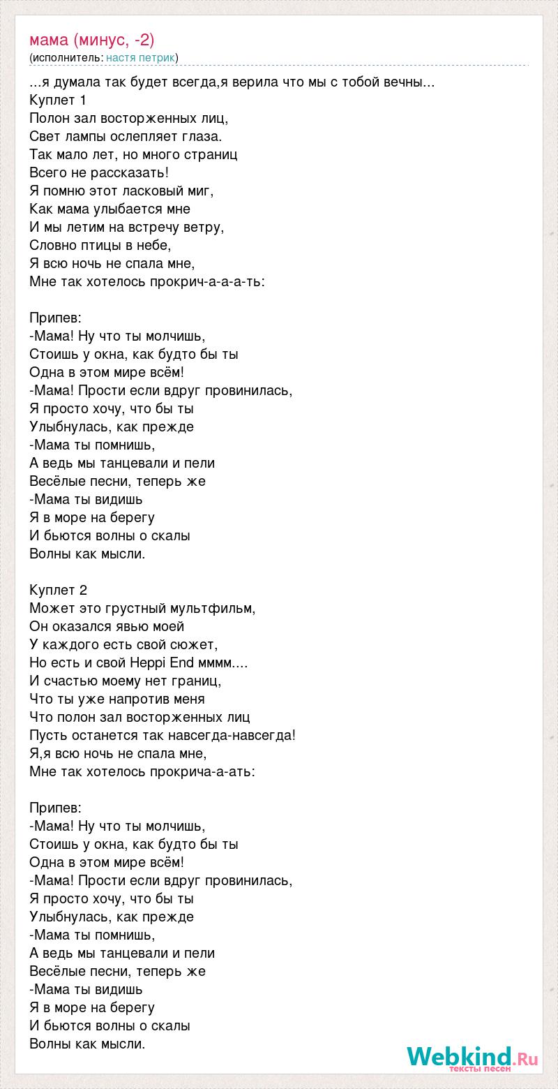 ...я думала так будет всегда,я верила что мы с тобой вечны... Куплет 1 Полон зал восторженных лиц, Свет лампы ослепляет глаза. Так мало лет, но много страниц Всего не рассказать! Я помню этот ласковый миг, Как мама улыбается мне И мы летим на встречу ветру, Словно птицы в небе, Я всю ночь не спала мне, Мне так хотелось прокрич-а-а-а-ть: Припев: -Мама! Ну что ты молчишь, Стоишь у окна, как будто бы ты Одна в этом мире всём! -Мама! Прости если вдруг провинилась, Я просто хочу, что бы ты Улыбнулась, как прежде -Мама ты помнишь, А ведь мы танцевали и пели Весёлые песни, теперь же -Мама ты видишь Я в море на берегу И бьются волны о скалы Волны как мысли. Куплет 2 Может это грустный мультфильм, Он оказался явью моей У каждого есть свой сюжет, Но есть и свой Heppi End мммм.... И счастью моему нет границ, Что ты уже напротив меня Что полон зал восторженных лиц Пусть останется так навсегда-навсегда! Я,я всю ночь не спала мне, Мне так хотелось прокрича-а-ать: Припев: -Мама! Ну что ты молчишь, Стоишь у окна, как будто бы ты Одна в этом мире всём! -Мама! Прости если вдруг провинилась, Я просто хочу, что бы ты Улыбнулась, как прежде -Мама ты помнишь, А ведь мы танцевали и пели Весёлые песни, теперь же -Мама ты видишь Я в море на берегу И бьются волны о скалы Волны как мысли.