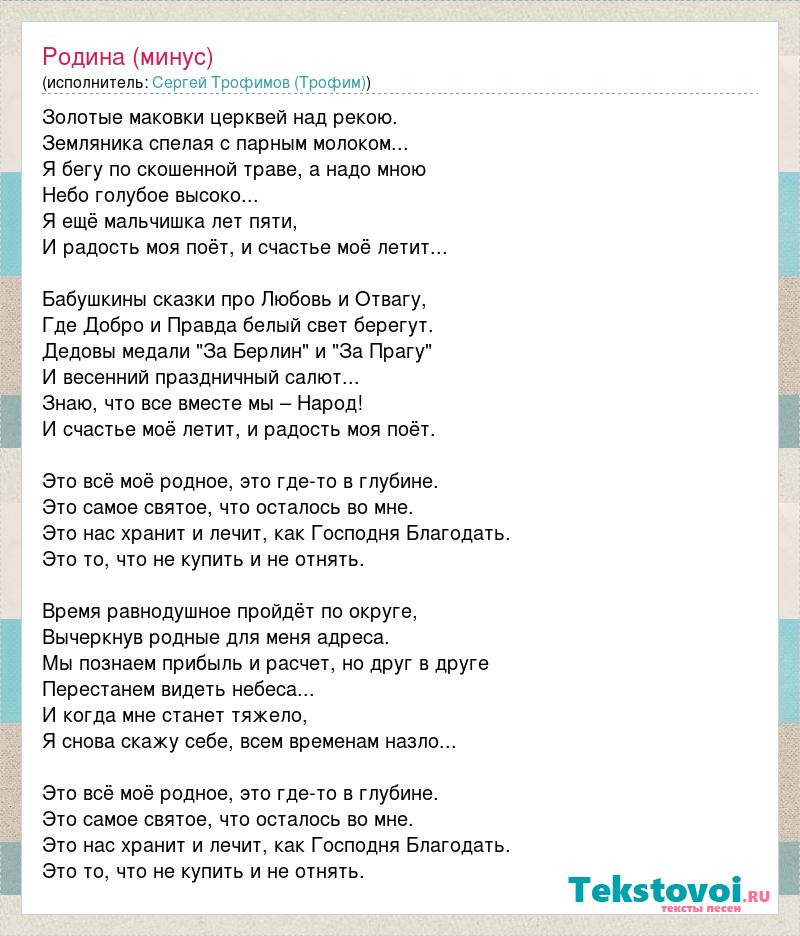Золотые маковки церквей над рекою. Земляника спелая с парным молоком... Я бегу по скошенной траве, а надо мною Небо голубое высоко... Я ещё мальчишка лет пяти, И радость моя поёт, и счастье моё летит... Бабушкины сказки про Любовь и Отвагу, Где Добро и Правда белый свет берегут. Дедовы медали "За Берлин" и "За Прагу" И весенний праздничный салют... Знаю, что все вместе мы – Народ! И счастье моё летит, и радость моя поёт. Это всё моё родное, это где-то в глубине. Это самое святое, что осталось во мне. Это нас хранит и лечит, как Господня Благодать. Это то, что не купить и не отнять. Время равнодушное пройдёт по округе, Вычеркнув родные для меня адреса. Мы познаем прибыль и расчет, но друг в друге Перестанем видеть небеса... И когда мне станет тяжело, Я снова скажу себе, всем временам назло... Это всё моё родное, это где-то в глубине. Это самое святое, что осталось во мне. Это нас хранит и лечит, как Господня Благодать. Это то, что не купить и не отнять.