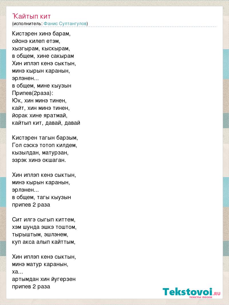 Кистэрен хинэ барам, ойонэ килеп етэм, хызгырам, кыскырам, в общем, хине сакырам Хин иплэп кенэ сыктын, минэ кырын каранын, эрлэнен... в общем, мине кыузын Припев(2раза): Юк, хин минэ тинен, кайт, хин минэ тинен, йорак хине яратмай, кайтып кит, давай, давай Кистэрен тагын барзым, Гол сэскэ тотоп килдем, кызылдан, матурзан, эзрэк хинэ окшаган. Хин иплэп кенэ сыктын, минэ кырын каранын, эрлэнен... в общем, тагы кыузын припев 2 раза Сит илгэ сыгып киттем, хэм шунда эшкэ тоштом, тырыштым, эшлэнем, куп акса алып кайттым, Хин иплэп кенэ сыктын, минэ матур каранын, ха... артымдан хин йугерзен припев 2 раза