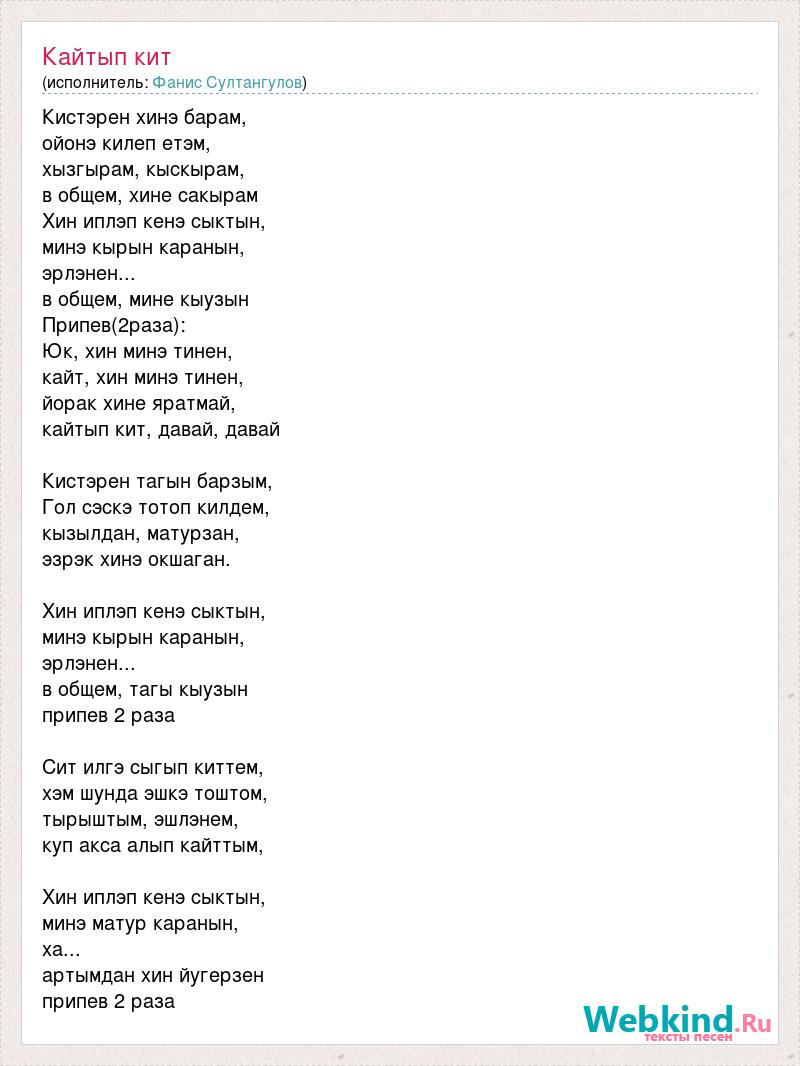 Кистэрен хинэ барам, ойонэ килеп етэм, хызгырам, кыскырам, в общем, хине сакырам Хин иплэп кенэ сыктын, минэ кырын каранын, эрлэнен... в общем, мине кыузын Припев(2раза): Юк, хин минэ тинен, кайт, хин минэ тинен, йорак хине яратмай, кайтып кит, давай, давай Кистэрен тагын барзым, Гол сэскэ тотоп килдем, кызылдан, матурзан, эзрэк хинэ окшаган. Хин иплэп кенэ сыктын, минэ кырын каранын, эрлэнен... в общем, тагы кыузын припев 2 раза Сит илгэ сыгып киттем, хэм шунда эшкэ тоштом, тырыштым, эшлэнем, куп акса алып кайттым, Хин иплэп кенэ сыктын, минэ матур каранын, ха... артымдан хин йугерзен припев 2 раза