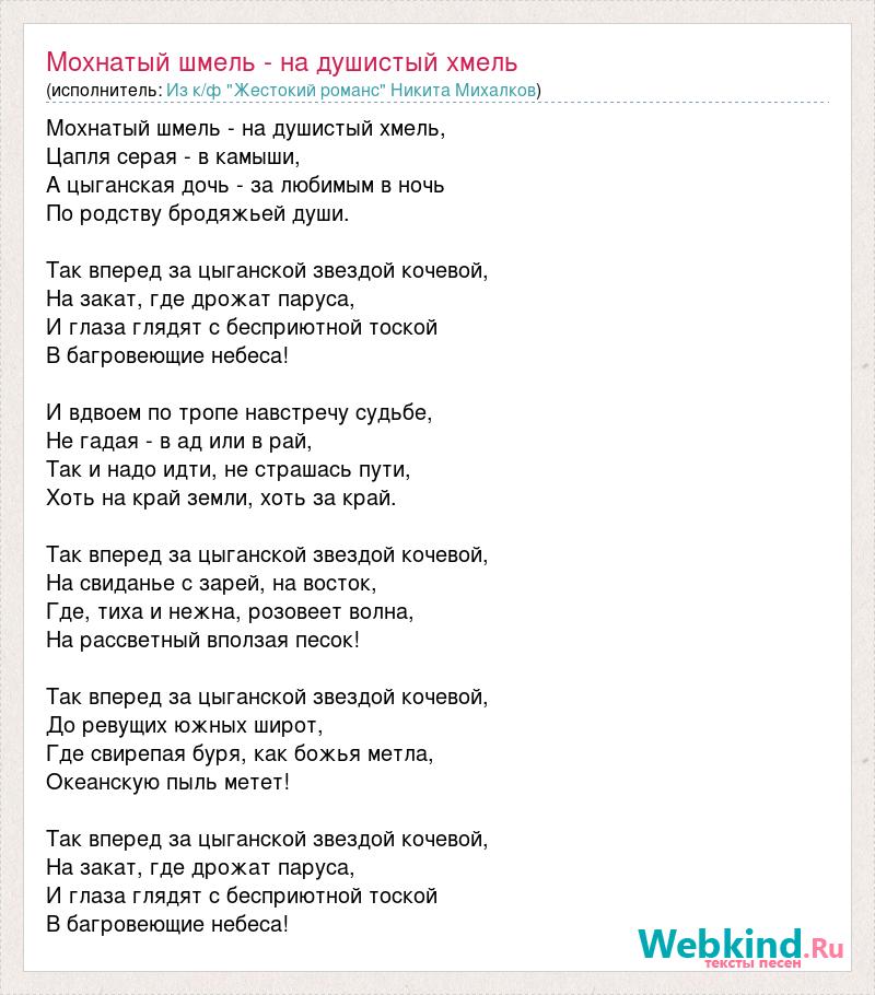 Мохнатый шмель - на душистый хмель, Цапля серая - в камыши, А цыганская дочь - за любимым в ночь По родству бродяжьей души. Так вперед за цыганской звездой кочевой, На закат, где дрожат паруса, И глаза глядят с бесприютной тоской В багровеющие небеса! И вдвоем по тропе навстречу судьбе, Не гадая - в ад или в рай, Так и надо идти, не страшась пути, Хоть на край земли, хоть за край. Так вперед за цыганской звездой кочевой, На свиданье с зарей, на восток, Где, тиха и нежна, розовеет волна, На рассветный вползая песок! Так вперед за цыганской звездой кочевой, До ревущих южных широт, Где свирепая буря, как божья метла, Океанскую пыль метет! Так вперед за цыганской звездой кочевой, На закат, где дрожат паруса, И глаза глядят с бесприютной тоской В багровеющие небеса!