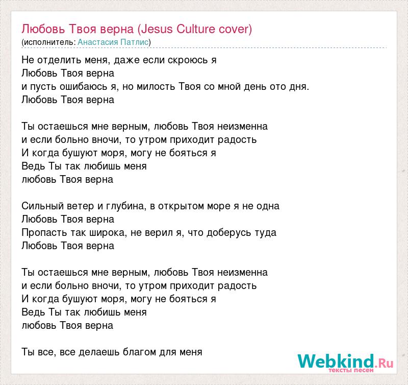 Не отделить меня, даже если скроюсь я Любовь Твоя верна и пусть ошибаюсь я, но милость Твоя со мной день ото дня. Любовь Твоя верна Ты остаешься мне верным, любовь Твоя неизменна и если больно вночи, то утром приходит радость И когда бушуют моря, могу не бояться я Ведь Ты так любишь меня любовь Твоя верна Сильный ветер и глубина, в открытом море я не одна Любовь Твоя верна Пропасть так широка, не верил я, что доберусь туда Любовь Твоя верна Ты остаешься мне верным, любовь Твоя неизменна и если больно вночи, то утром приходит радость И когда бушуют моря, могу не бояться я Ведь Ты так любишь меня любовь Твоя верна Ты все, все делаешь благом для меня