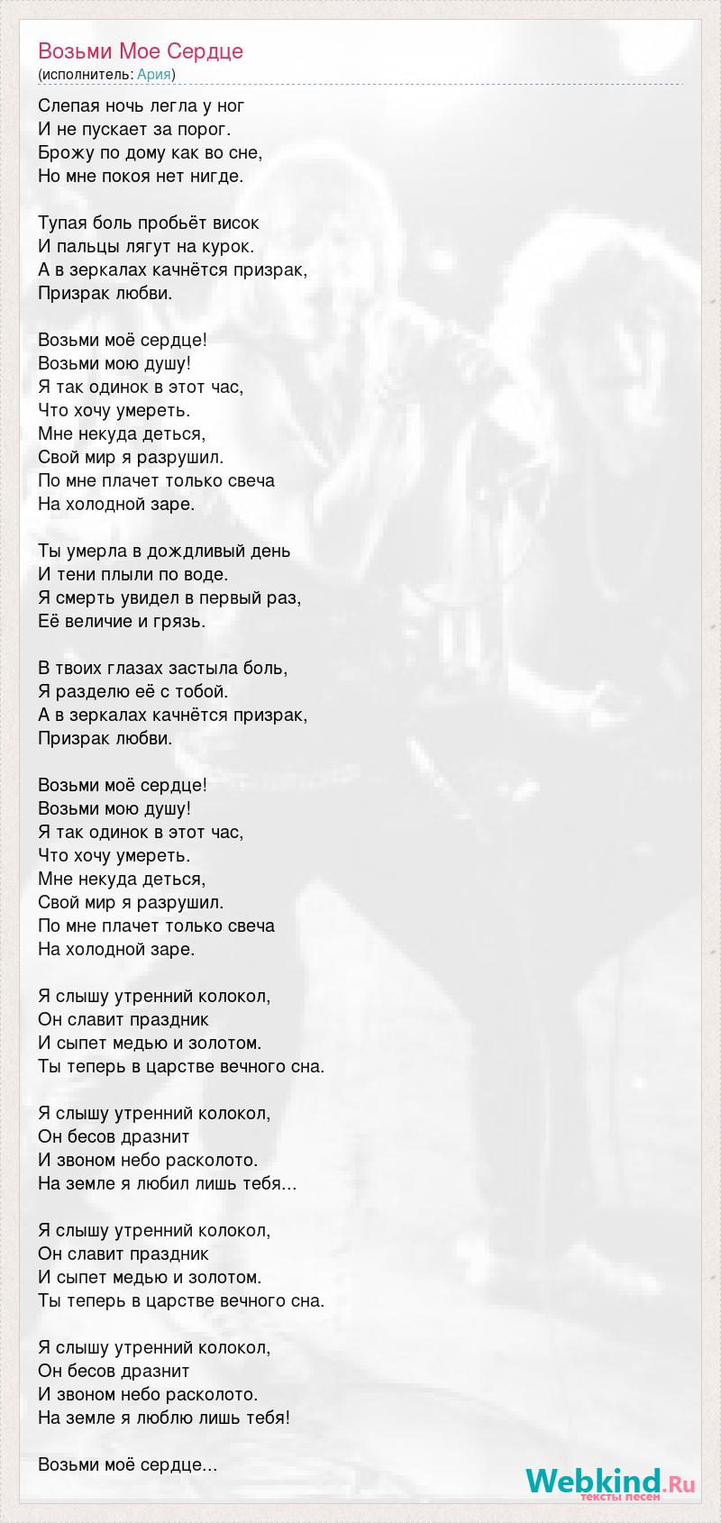 Слепая ночь легла у ног И не пускает за порог. Брожу по дому как во сне, Но мне покоя нет нигде. Тупая боль пробьёт висок И пальцы лягут на курок. А в зеркалах качнётся призрак, Призрак любви. Возьми моё сердце! Возьми мою душу! Я так одинок в этот час, Что хочу умереть. Мне некуда деться, Свой мир я разрушил. По мне плачет только свеча На холодной заре. Ты умерла в дождливый день И тени плыли по воде. Я смерть увидел в первый раз, Её величие и грязь. В твоих глазах застыла боль, Я разделю её с тобой. А в зеркалах качнётся призрак, Призрак любви. Возьми моё сердце! Возьми мою душу! Я так одинок в этот час, Что хочу умереть. Мне некуда деться, Свой мир я разрушил. По мне плачет только свеча На холодной заре. Я слышу утренний колокол, Он славит праздник И сыпет медью и золотом. Ты теперь в царстве вечного сна. Я слышу утренний колокол, Он бесов дразнит И звоном небо расколото. На земле я любил лишь тебя... Я слышу утренний колокол, Он славит праздник И сыпет медью и золотом. Ты теперь в царстве вечного сна. Я слышу утренний колокол, Он бесов дразнит И звоном небо расколото. На земле я люблю лишь тебя! Возьми моё сердце...