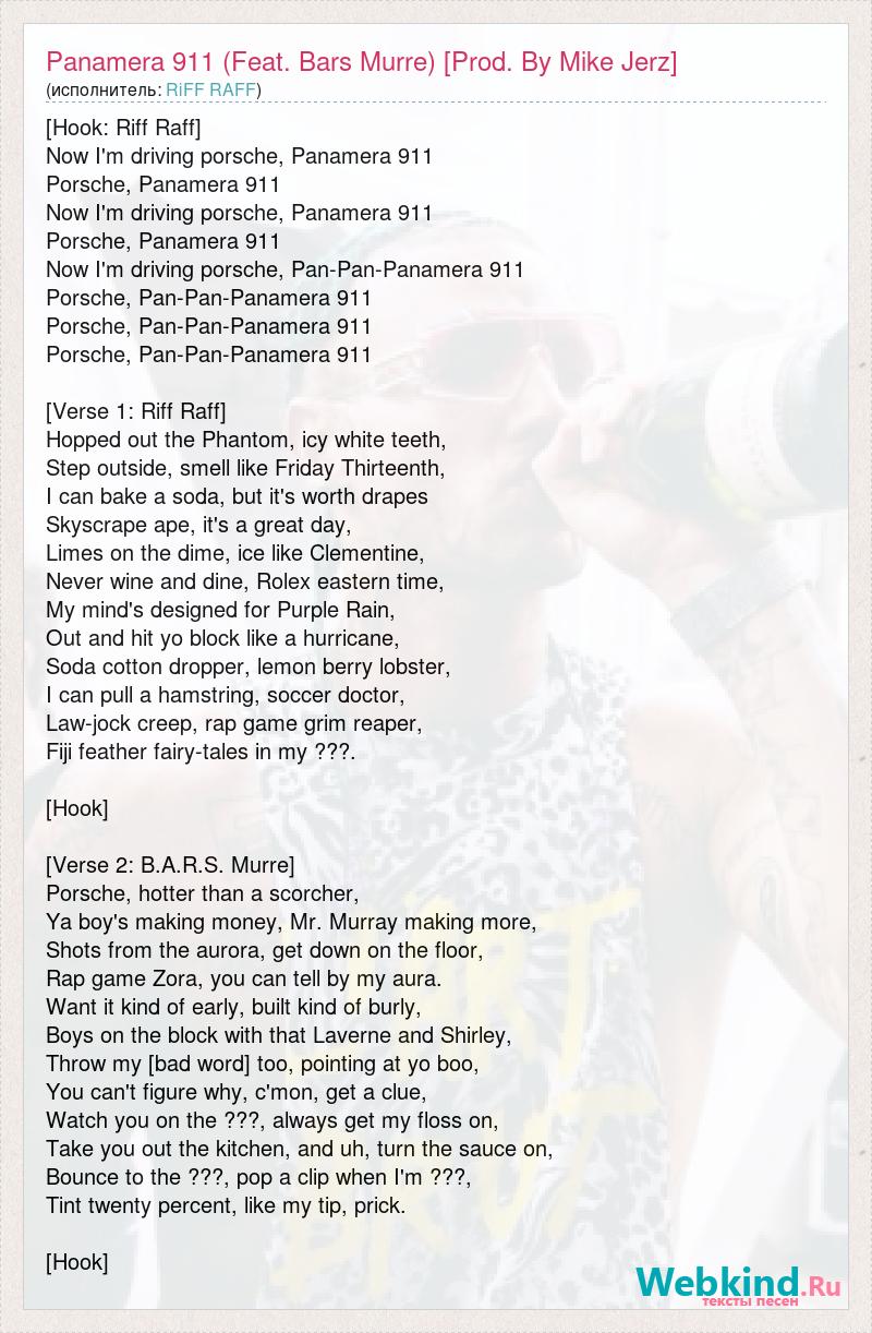 [Hook: Riff Raff] Now I'm driving porsche, Panamera 911 Porsche, Panamera 911 Now I'm driving porsche, Panamera 911 Porsche, Panamera 911 Now I'm driving porsche, Pan-Pan-Panamera 911 Porsche, Pan-Pan-Panamera 911 Porsche, Pan-Pan-Panamera 911 Porsche, Pan-Pan-Panamera 911 [Verse 1: Riff Raff] Hopped out the Phantom, icy white teeth, Step outside, smell like Friday Thirteenth, I can bake a soda, but it's worth drapes Skyscrape ape, it's a great day, Limes on the dime, ice like Clementine, Never wine and dine, Rolex eastern time, My mind's designed for Purple Rain, Out and hit yo block like a hurricane, Soda cotton dropper, lemon berry lobster, I can pull a hamstring, soccer doctor, Law-jock creep, rap game grim reaper, Fiji feather fairy-tales in my ???. [Hook] [Verse 2: B.A.R.S. Murre] Porsche, hotter than a scorcher, Ya boy's making money, Mr. Murray making more, Shots from the aurora, get down on the floor, Rap game Zora, you can tell by my aura. Want it kind of early, built kind of burly, Boys on the block with that Laverne and Shirley, Throw my [bad word] too, pointing at yo boo, You can't figure why, c'mon, get a clue, Watch you on the ???, always get my floss on, Take you out the kitchen, and uh, turn the sauce on, Bounce to the ???, pop a clip when I'm ???, Tint twenty percent, like my tip, prick. [Hook]