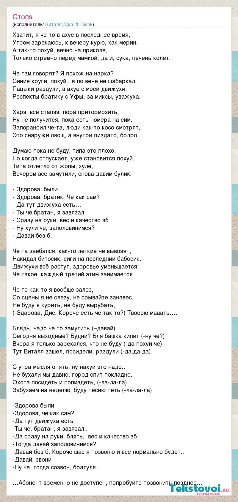 Хватит, я че-то в ахуе в последнее время, Утром зарекаюсь, к вечеру курю, как мерин. А так-то похуй, вечно на приколе, Только стремно перед мамкой, да и, сука, печень колет. Че там говорят? Я похож на нарка? Синие круги, похуй.. я по вене не шабаркал. Пацыки раздули, в ахуе с моей движухи, Респекты братику с Уфы, за миксы, уважуха. Харэ, всё стапээ, пора притормозить, Ну не получится, пока есть номера на сим. Запораноил че-та, люди как-то косо смотрят, Это снаружи овощ, а внутри пиздато, бодро. Думаю пока не буду, типа это плохо, Но когда отпускает, уже становится похуй. Типа отлегло от жопы, хуле, Вечером все замутили, снова давим булик. - Здорова, были.. - Здорова, братик. Че как сам? - Да тут движуха есть… - Ты че братан, я завязал - Сразу на руки, вес и качество зб - Ну хули че, заполовинимся? - Давай без б. Че та заебался, как-то легкие не вывозят, Накидал битосик, сиги на последний бабосик. Движухи всё растут, здоровье уменьшается, Че такое, каждый третий этим занимается. Че то как-то я вообще залез, Со сцены я не слезу, не срывайте занавес. Не буду я курить, не буду вырубать, (-Здарова, Дис. Короче есть че так то?) Твооою мааать…. Блядь, надо че то замутить (–давай) Сегодня выходные? Будни? Бля башка кипит (-ну че?) Вчера я только зарекался, что не буду (-да похуй че) Тут Виталя зашел, посидели, раздули (-да.да,да) С утра мысля опять: ну нахуй это надо.. Не бухали мы давно, город спит покладно. Охота посидеть и попиздеть, (-ла-ла-ла) Забухаем на неделю, буду песню петь (-ла-ла-ла) -Здорова были -Здорова, че как сам? -Да тут движуха есть -Ты че, братан, я завязал.. -Да сразу на руки, блять, вес и качество зб -Тогда давай заполовинимся? -Давай без б. Короче щас я позвоню и все нормально будет.. -Давай, звони -Ну че тогда созвон, братуля… …Абонент временно не доступен, попробуйте позвонить позднее…