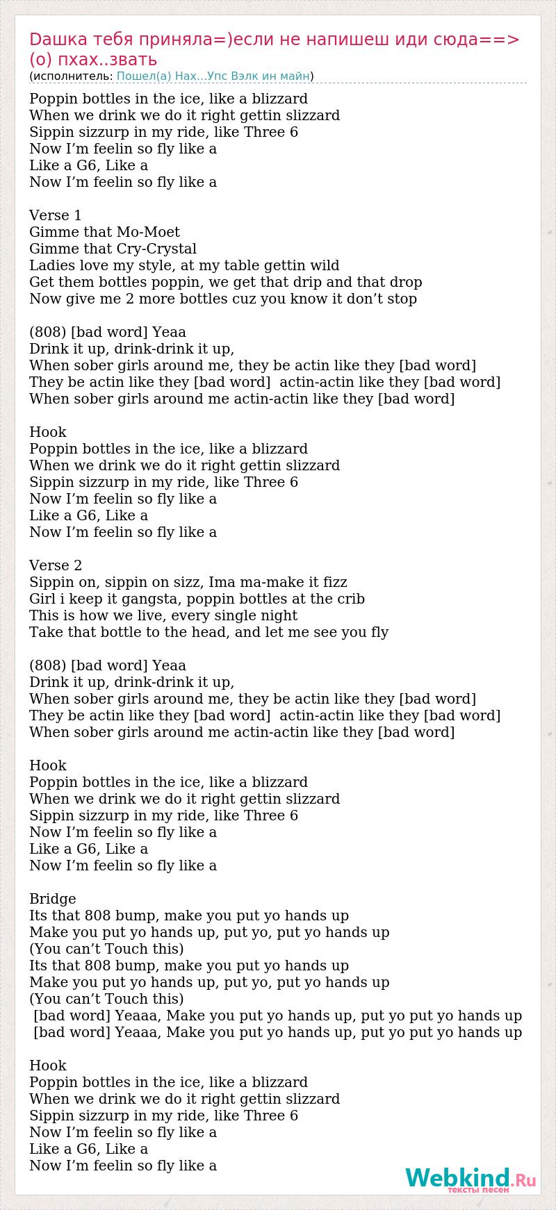 Poppin bottles in the ice, like a blizzard When we drink we do it right gettin slizzard Sippin sizzurp in my ride, like Three 6 Now I’m feelin so fly like a Like a G6, Like a Now I’m feelin so fly like a Verse 1 Gimme that Mo-Moet Gimme that Cry-Crystal Ladies love my style, at my table gettin wild Get them bottles poppin, we get that drip and that drop Now give me 2 more bottles cuz you know it don’t stop (808) [bad word] Yeaa Drink it up, drink-drink it up, When sober girls around me, they be actin like they [bad word] They be actin like they [bad word] actin-actin like they [bad word] When sober girls around me actin-actin like they [bad word] Hook Poppin bottles in the ice, like a blizzard When we drink we do it right gettin slizzard Sippin sizzurp in my ride, like Three 6 Now I’m feelin so fly like a Like a G6, Like a Now I’m feelin so fly like a Verse 2 Sippin on, sippin on sizz, Ima ma-make it fizz Girl i keep it gangsta, poppin bottles at the crib This is how we live, every single night Take that bottle to the head, and let me see you fly (808) [bad word] Yeaa Drink it up, drink-drink it up, When sober girls around me, they be actin like they [bad word] They be actin like they [bad word] actin-actin like they [bad word] When sober girls around me actin-actin like they [bad word] Hook Poppin bottles in the ice, like a blizzard When we drink we do it right gettin slizzard Sippin sizzurp in my ride, like Three 6 Now I’m feelin so fly like a Like a G6, Like a Now I’m feelin so fly like a Bridge Its that 808 bump, make you put yo hands up Make you put yo hands up, put yo, put yo hands up (You can’t Touch this) Its that 808 bump, make you put yo hands up Make you put yo hands up, put yo, put yo hands up (You can’t Touch this) [bad word] Yeaaa, Make you put yo hands up, put yo put yo hands up [bad word] Yeaaa, Make you put yo hands up, put yo put yo hands up Hook Poppin bottles in the ice, like a blizzard When we drink we do it right gettin slizzard Sippin sizzurp in my ride, like Three 6 Now I’m feelin so fly like a Like a G6, Like a Now I’m feelin so fly like a
