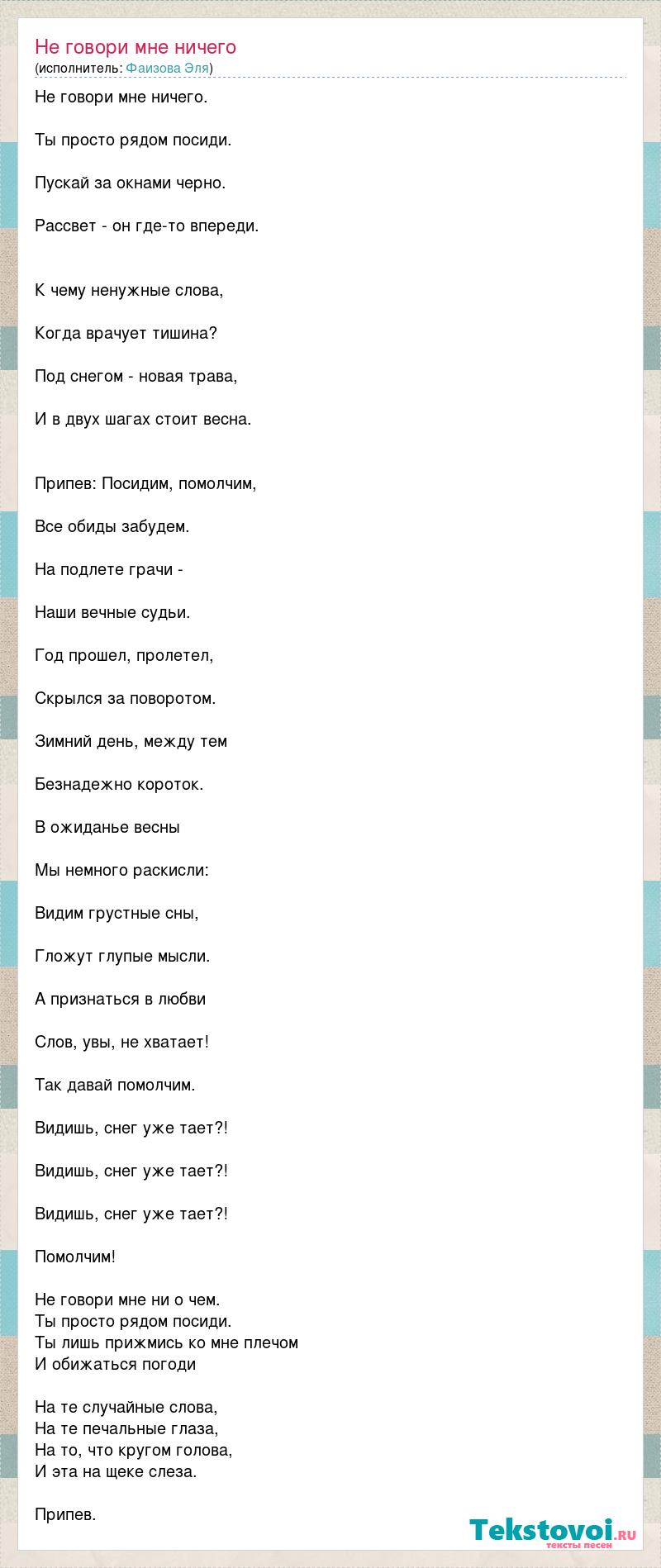 Не говори мне ничего. Ты просто рядом посиди. Пускай за окнами черно. Рассвет - он где-то впереди. К чему ненужные слова, Когда врачует тишина? Под снегом - новая трава, И в двух шагах стоит весна. Припев: Посидим, помолчим, Все обиды забудем. На подлете грачи - Наши вечные судьи. Год прошел, пролетел, Скрылся за поворотом. Зимний день, между тем Безнадежно короток. В ожиданье весны Мы немного раскисли: Видим грустные сны, Гложут глупые мысли. А признаться в любви Слов, увы, не хватает! Так давай помолчим. Видишь, снег уже тает?! Видишь, снег уже тает?! Видишь, снег уже тает?! Помолчим! Не говори мне ни о чем. Ты просто рядом посиди. Ты лишь прижмись ко мне плечом И обижаться погоди На те случайные слова, На те печальные глаза, На то, что кругом голова, И эта на щеке слеза. Припев.