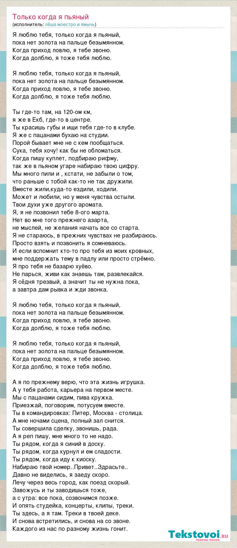 Я люблю тебя, только когда я пьяный, пока нет золота на пальце безымянном. Когда приход ловлю, я тебе звоню. Когда долблю, я тоже тебя люблю. Я люблю тебя, только когда я пьяный, пока нет золота на пальце безымянном. Когда приход ловлю, я тебе звоню. Когда долблю, я тоже тебя люблю. Ты где-то там, на 120-ом км, я же в Екб, где-то в центре. Ты красишь губы и ищи тебя где-то в клубе. Я же с пацанами бухаю на студии. Порой бывает мне не с кем пообщаться. Сука, тебя хочу! как бы не обломаться. Когда пишу куплет, подбираю рифму, так же в пьяном угаре набираю твою цифру. Мы много пили и , кстати, не забыли о том, что раньше с тобой как-то не так дружили. Вместе жили,куда-то ездили, ходили. Может и любили, но у меня чувства остыли. Твои духи уже другого аромата. Я, я не позвонил тебе 8-ого марта. Нет во мне того прежнего азарта, не мыслей, не желания начать все со старта. Я не стараюсь, в прежних чувствах не разбираюсь. Просто взять и позвонить я сомневаюсь. И если вспомнит кто-то про тебя из моих кровных, мне поддержать тему в падлу или просто стрёмно. Я про тебя не базарю хуёво. Не парься, живи как знаешь там, развлекайся. Я сёдня трезвый, а значит ты не нужна пока, а завтра дам рывка и жди звонка. Я люблю тебя, только когда я пьяный, пока нет золота на пальце безымянном. Когда приход ловлю, я тебе звоню. Когда долблю, я тоже тебя люблю. Я люблю тебя, только когда я пьяный, пока нет золота на пальце безымянном. Когда приход ловлю, я тебе звоню. Когда долблю, я тоже тебя люблю. А я по прежнему верю, что эта жизнь игрушка. А у тебя работа, карьера на первом месте. Мы с пацанами сидим, пива кружка. Приезжай, поговорим, потусуем вместе. Ты в командировках: Питер, Москва - столица. А мне ночами сцена, полный зал снится. Ты совершила сделку, звонишь, рада. А я реп пишу, мне много то не надо. Ты рядом, когда я синий в доску. Ты рядом, когда курнул и ем сладости. Ты рядом, когда иду к киоску. Набираю твой номер..Привет..Здрасьте.. Давно не виделись, я заеду скоро. Лечу через весь город, как поезд скорый. Завожусь и ты заводишься тоже, а с утра: все пока, созвонимся позже. И опять студейка, концерты, клипы, треки. Ты здесь, а я там. Треки в твоей деке. И снова встретились, и снова на со звоне. Каждого из нас по разному жизнь гонит.