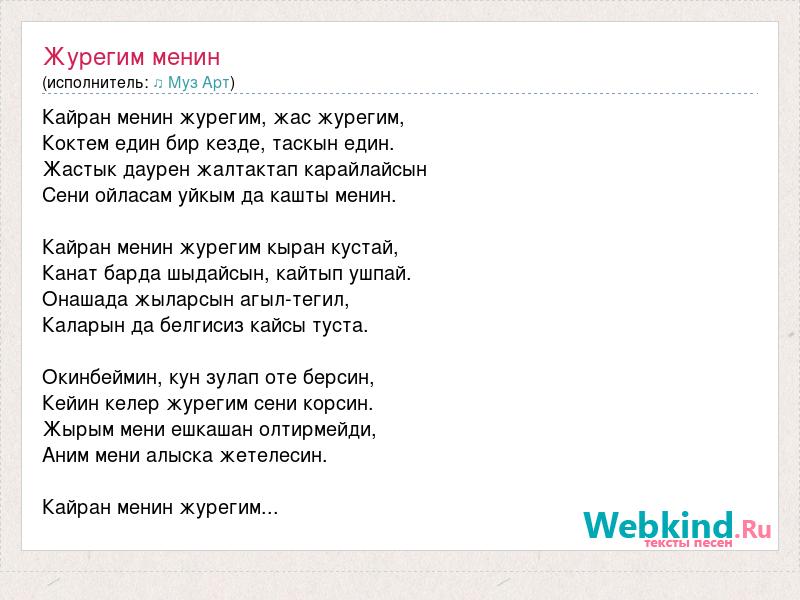 Кайран менин журегим, жас журегим, Коктем един бир кезде, таскын един. Жастык даурен жалтактап карайлайсын Сени ойласам уйкым да кашты менин. Кайран менин журегим кыран кустай, Канат барда шыдайсын, кайтып ушпай. Онашада жыларсын агыл-тегил, Каларын да белгисиз кайсы туста. Окинбеймин, кун зулап оте берсин, Кейин келер журегим сени корсин. Жырым мени ешкашан олтирмейди, Аним мени алыска жетелесин. Кайран менин журегим...